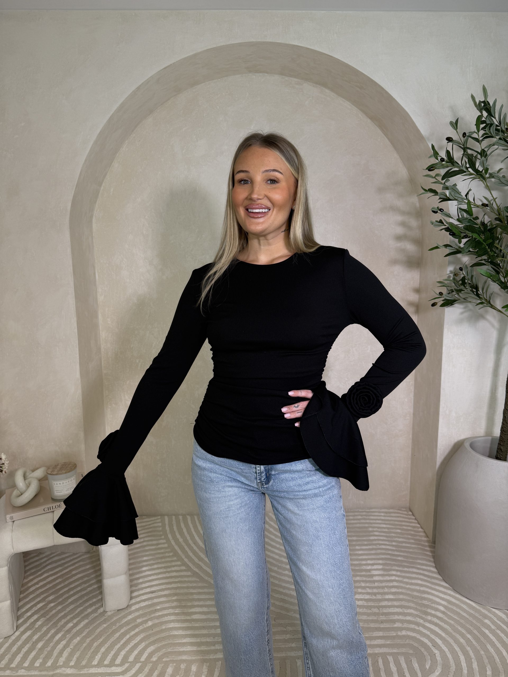 Elegancka, dopasowana bluzka wykonana z elastycznego materiału z efektownym marszczeniem w talii i dekoracyjną rozetą na rękawie. Subtelne falbanki przy mankietach dodają całości romantycznego charakteru. Świetnie wygląda zarówno z jeansami, jak i ze spodnicą.