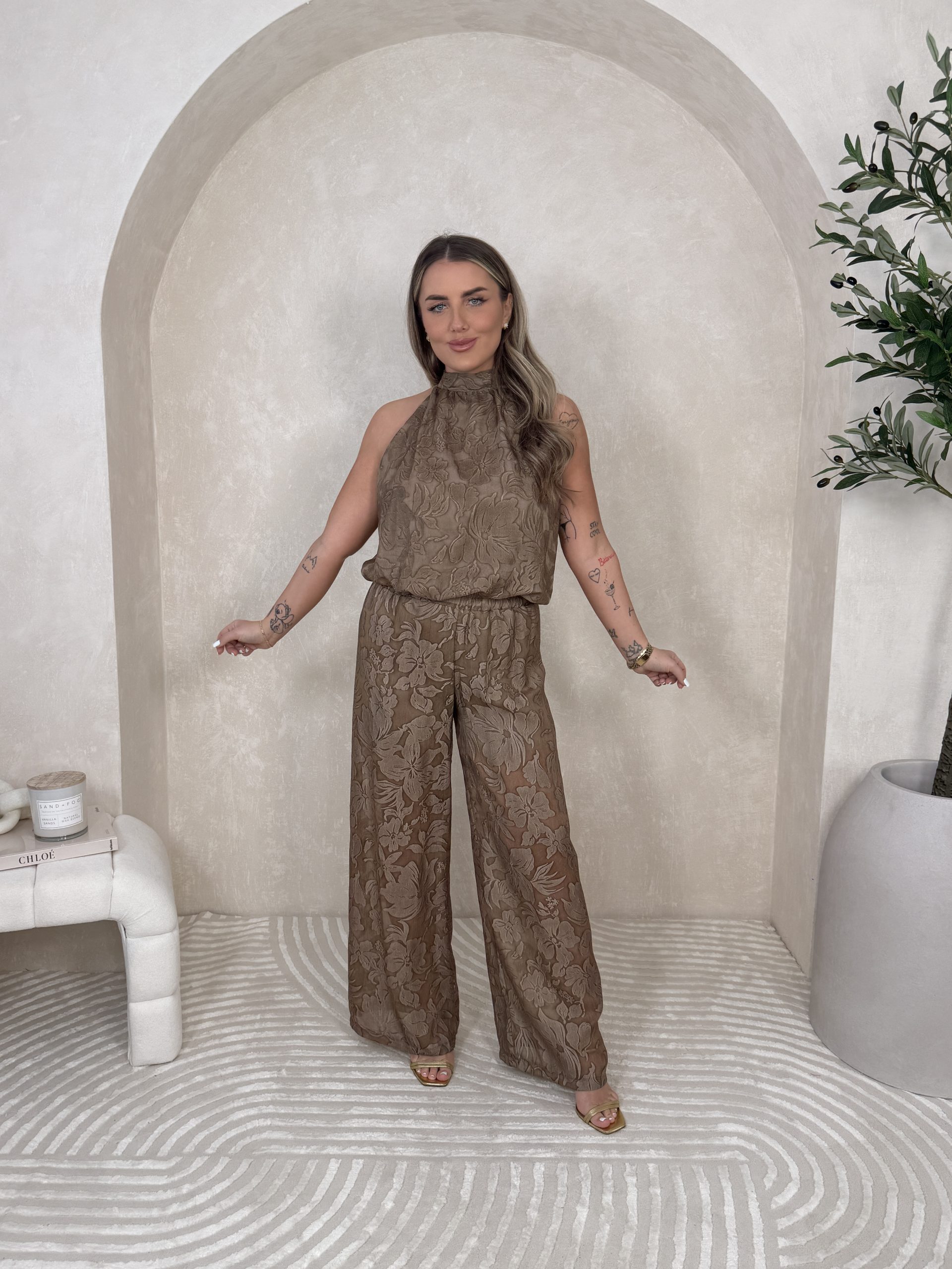 Elegancki komplet z delikatnego, lekko połyskującego materiału, składający się z długich spodni i topu. Subtelny wzór oraz luźny krój zapewnia wygodę noszenia i stylowy wygląd. Idealny na letnie wieczory i uroczystości.