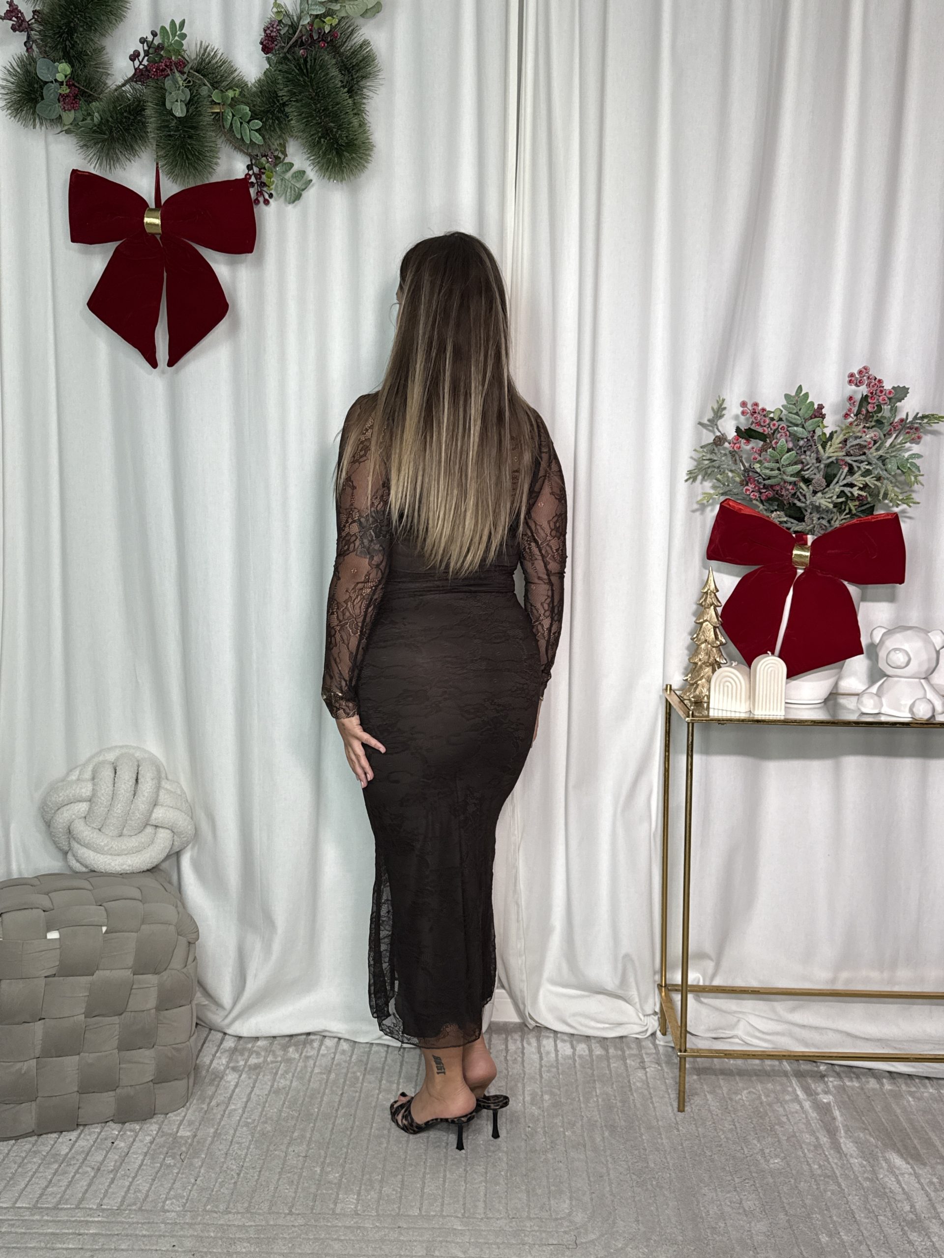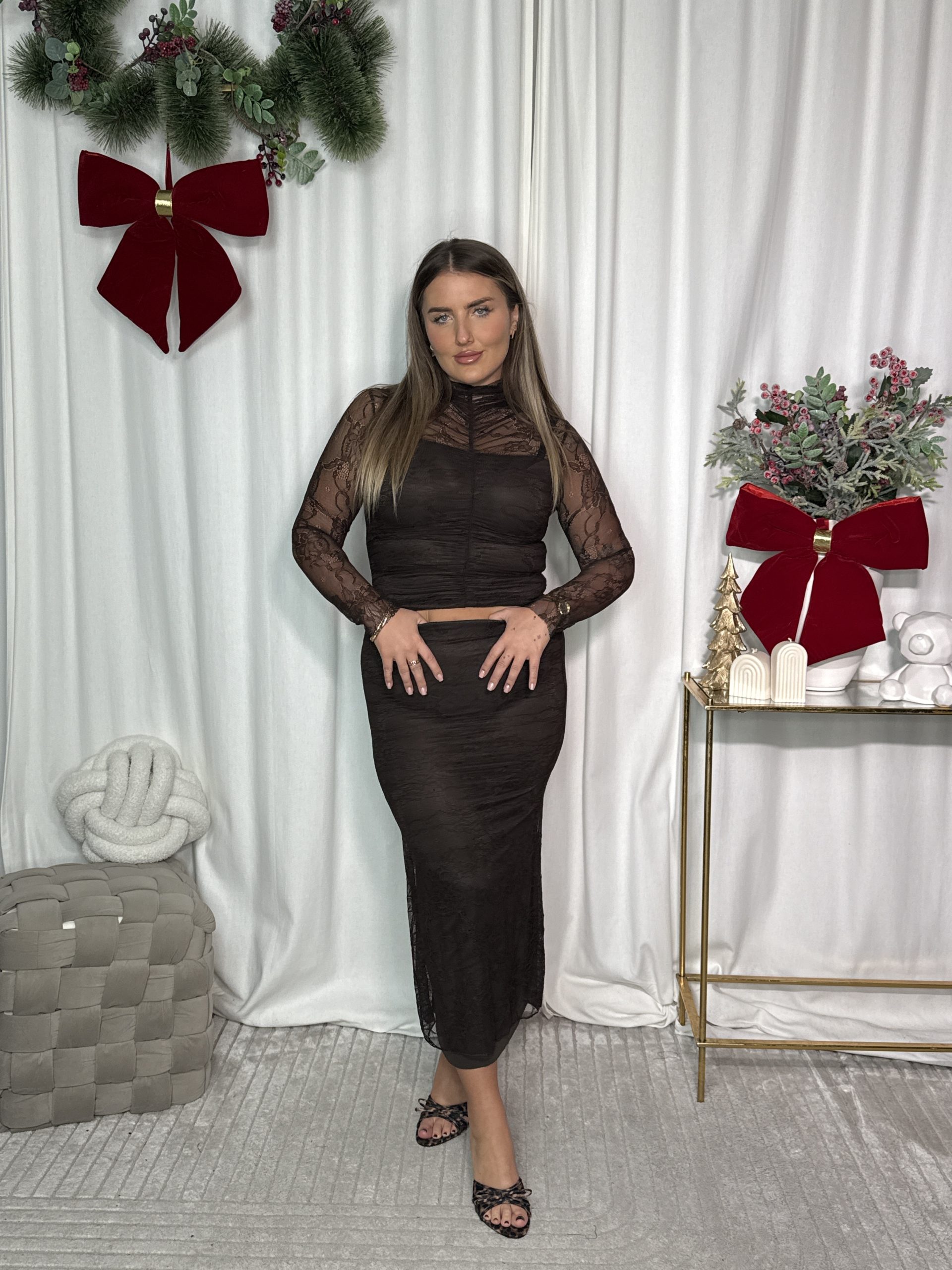 Komplet  łączy bluzkę ma długi rękaw oraz długą, koronkową spódnicę, tworząc wyrazistą i harmonijną stylizację. Bluzka odkreśla linię ramion i talii, zapewniając jednocześnie wygodne dopasowanie. Spódnica maxi z subtelną koronką dodaje lekkości i elegancji, tworząc efekt wysmuklenia sylwetki. Całość prezentuje się stylowo zarówno podczas uroczystości, jak i wieczornych wyjść. To kompletny zestaw, który łączy kobiecość, wygodę i wyrazisty charakter.