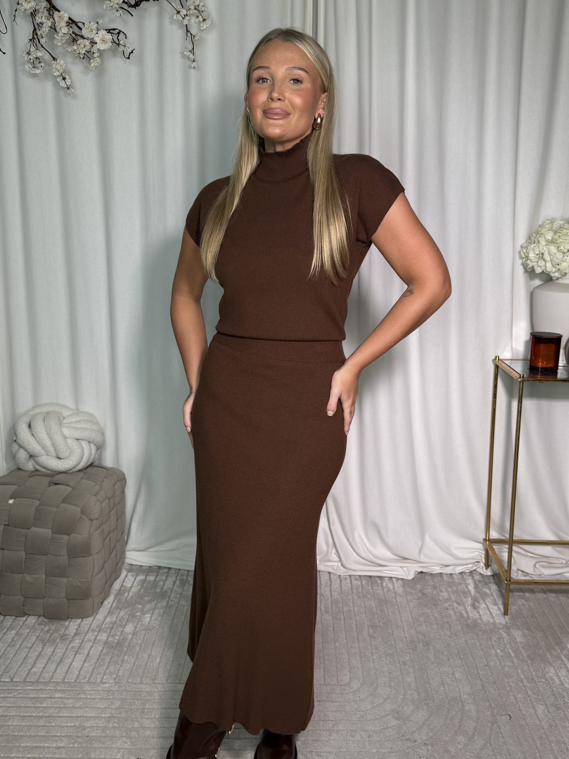 Komplet Claudy to dzianinowy set z golfem i spódniczka! Dodaj fajną marynarkę lub kurtkę a stylizacja gotowa!