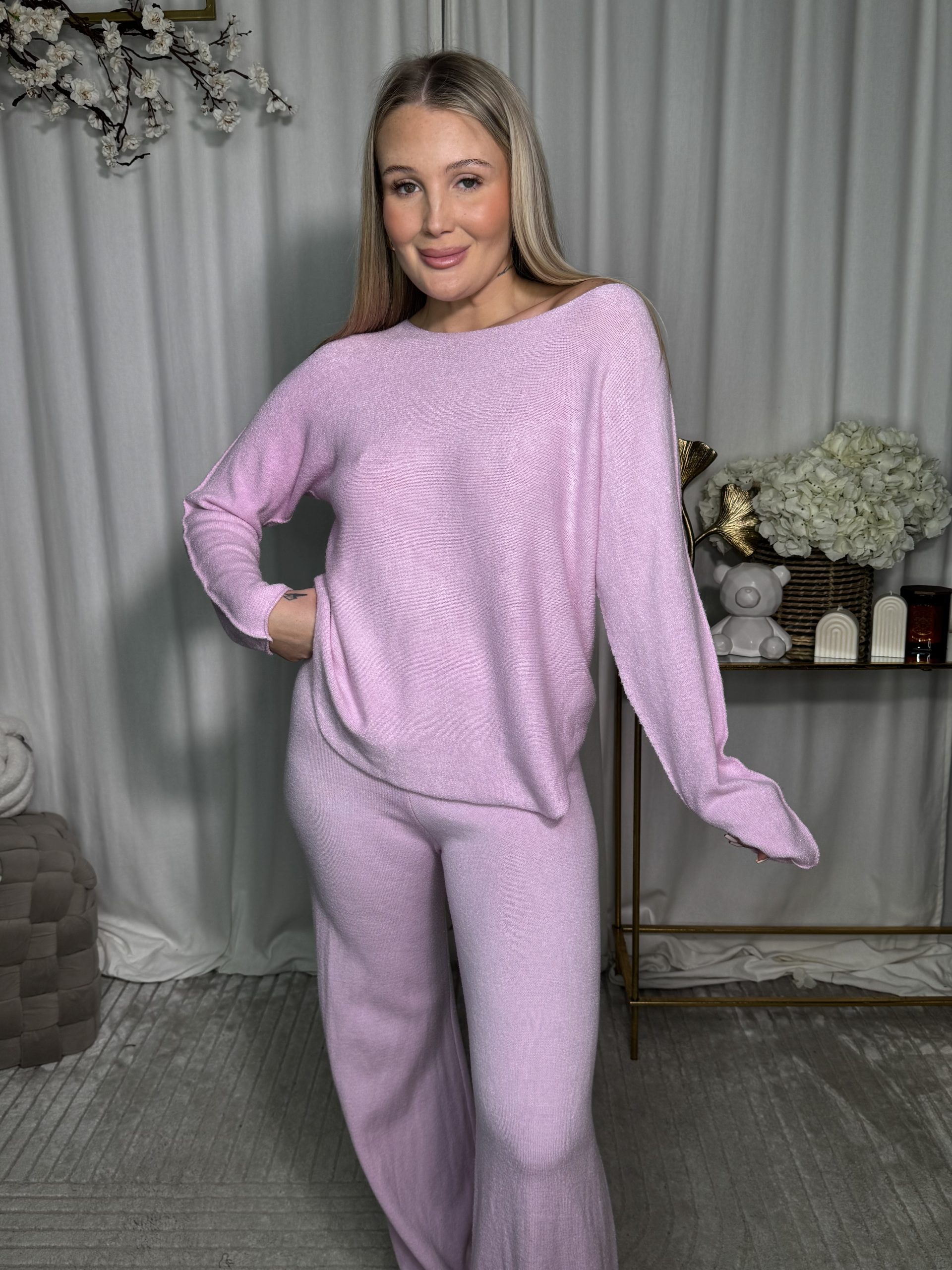 Dzianinowy komplet posiada miękką bluzę o luźnym kroju połączona z wygodnymi i cozy spodniami  z szeroką nogawką. Całość tworzy stylową jedność i gotowy zestaw na wyjście czy to na spacer, randkę lub na spokojniejszy dzień w domku. Występują w czterech wariantach kolorystycznych.