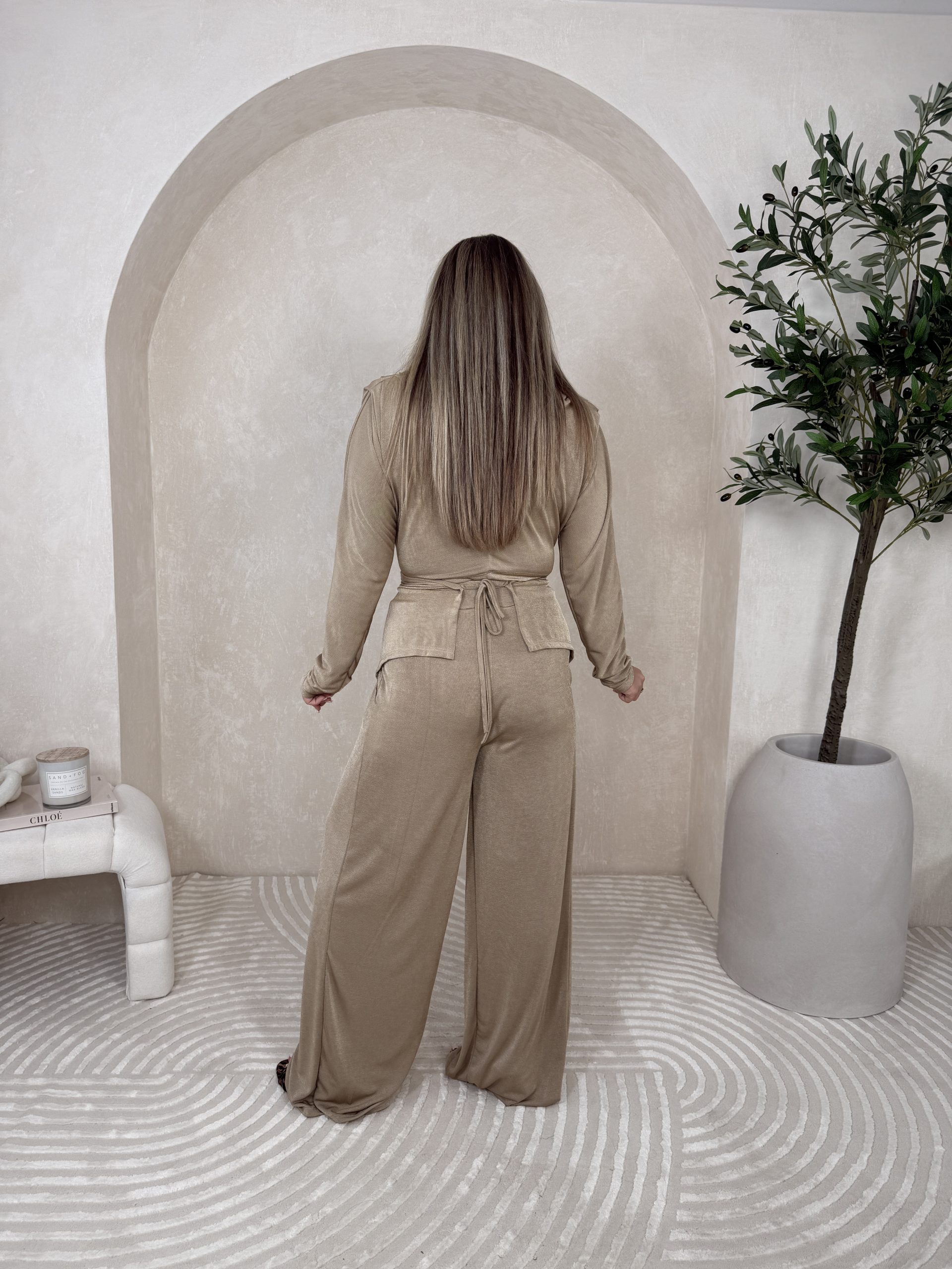 Elegancki komplet, który subtelnie połyskuje i przyciąga spojrzenia. Lekko lejąca bluzka z dekoltem i wiązaniem pięknie układa się na sylwetce, a dopasowane spodnie dopełniają całość, tworząc stylowy i nowoczesny look.