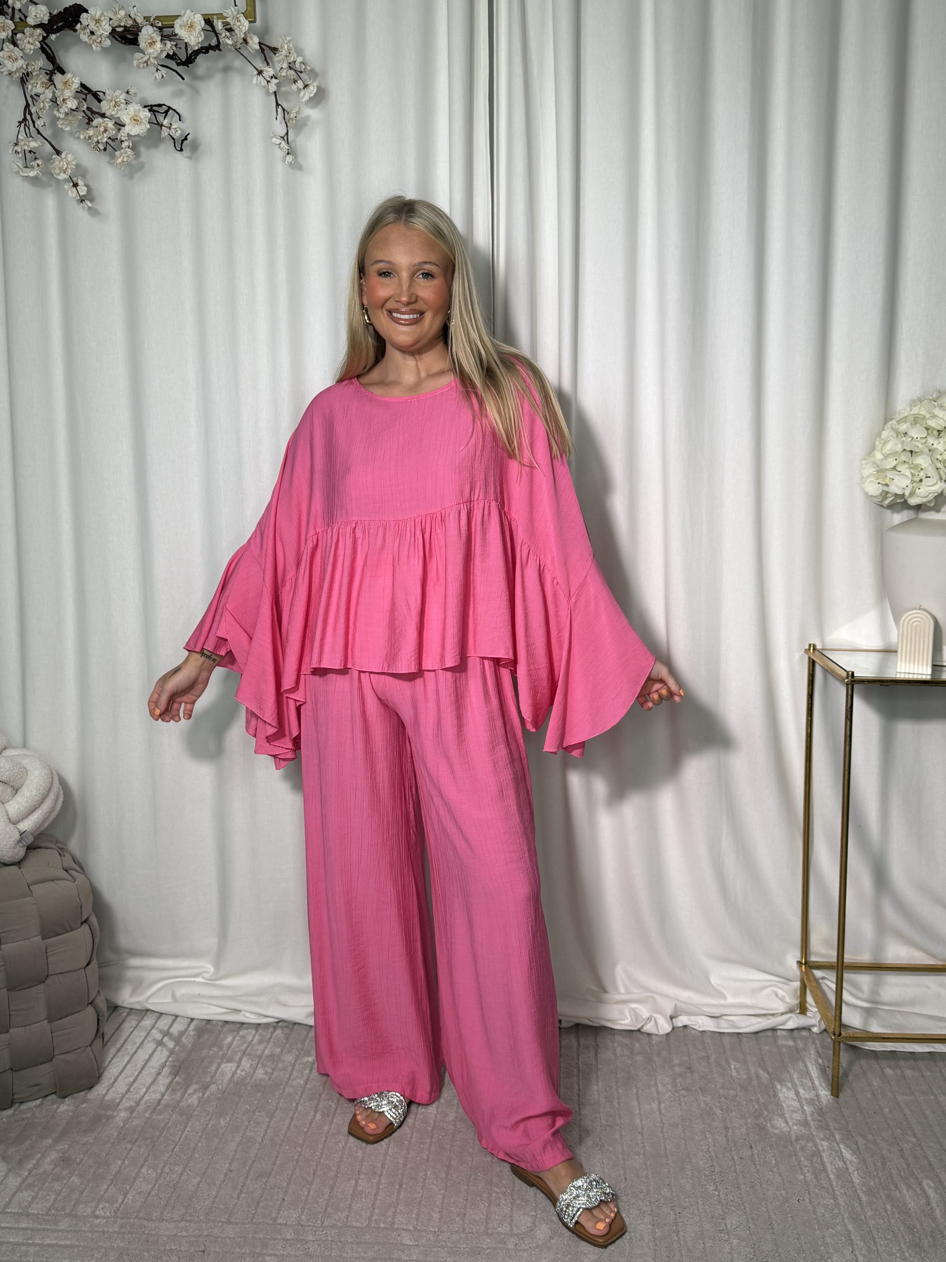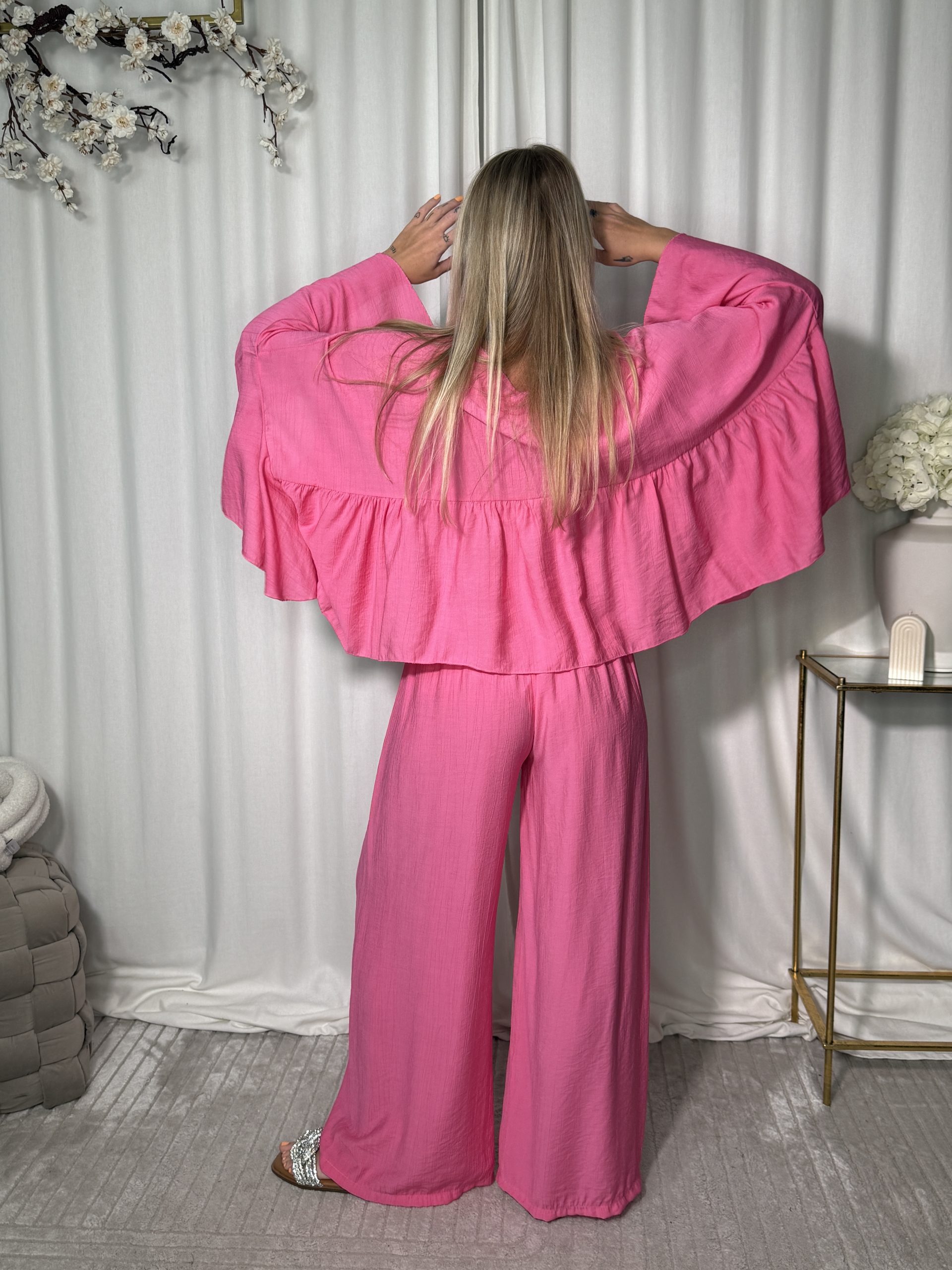 Komplet Polly to esencja wakacyjnej lekkości i swobody! Składa się z luźnej bluzki z efektownymi, szerokimi rękawami oraz szerokich spodni o prostym kroju. Wykonany z przewiewnego, miękkiego materiału, który pięknie układa się na sylwetce i zapewnia maksymalny komfort. Idealny zarówno na plażowy spacer, jak i luźne wyjście do miasta. Stylowy, nonszalancki i totalnie na czasie!