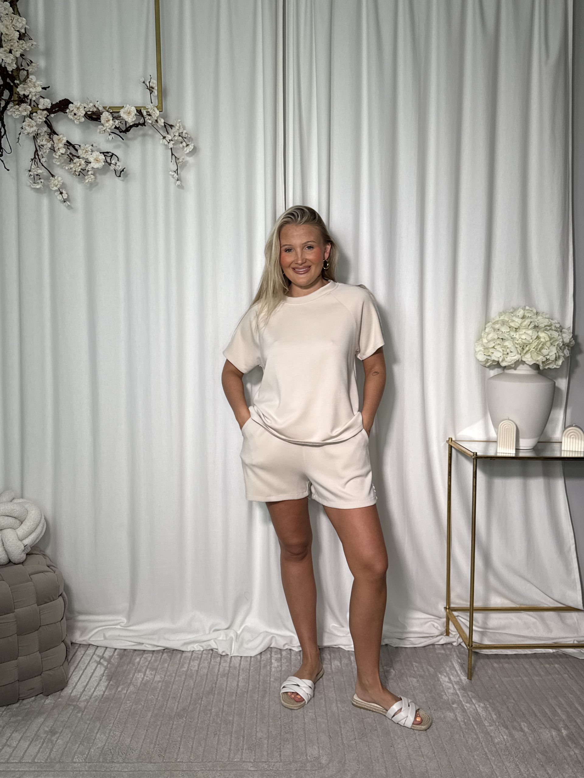Komplet Sella to idealne połączenie wygody i stylu na letnie dni! Luźny T-shirt z delikatnym, koronkowym detalem na rękawach i szorty z wysokim stanem tworzą niezobowiązujący, ale kobiecy zestaw. Uszyty z miękkiego, elastycznego materiału, który dopasowuje się do sylwetki i zapewnia maksymalny komfort. Dostępny w dwóch kolorach – klasycznej czerni i subtelnym beżu. Na spacer, na plażę, na domówkę – Sella zawsze pasuje!