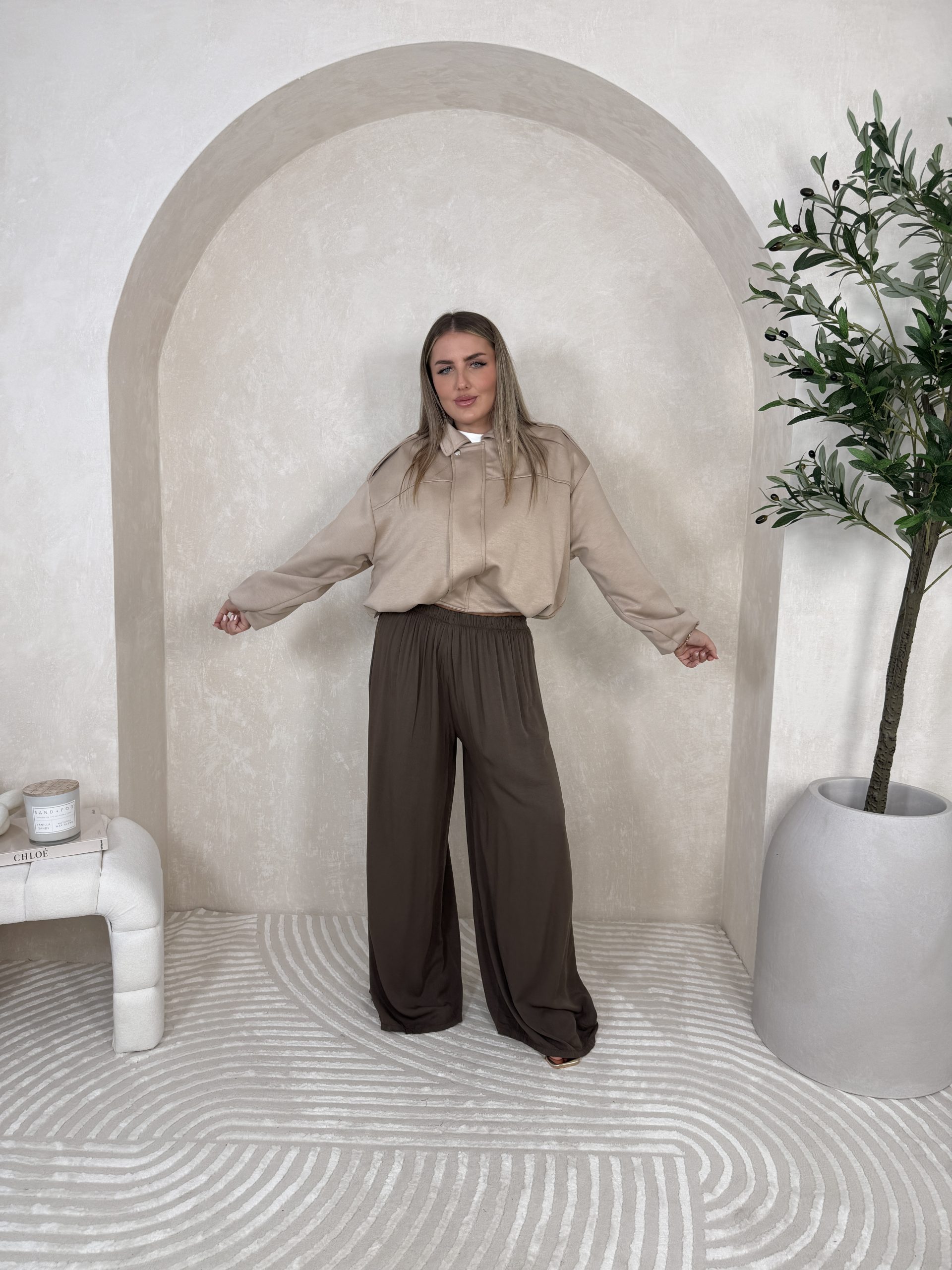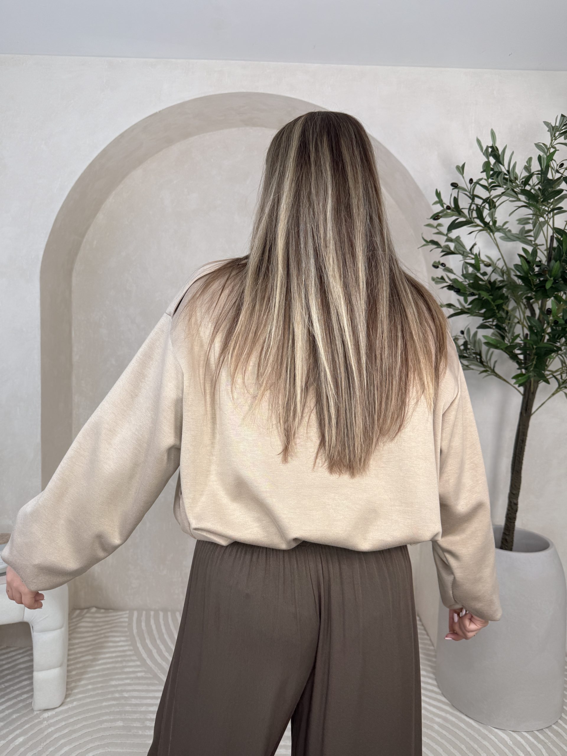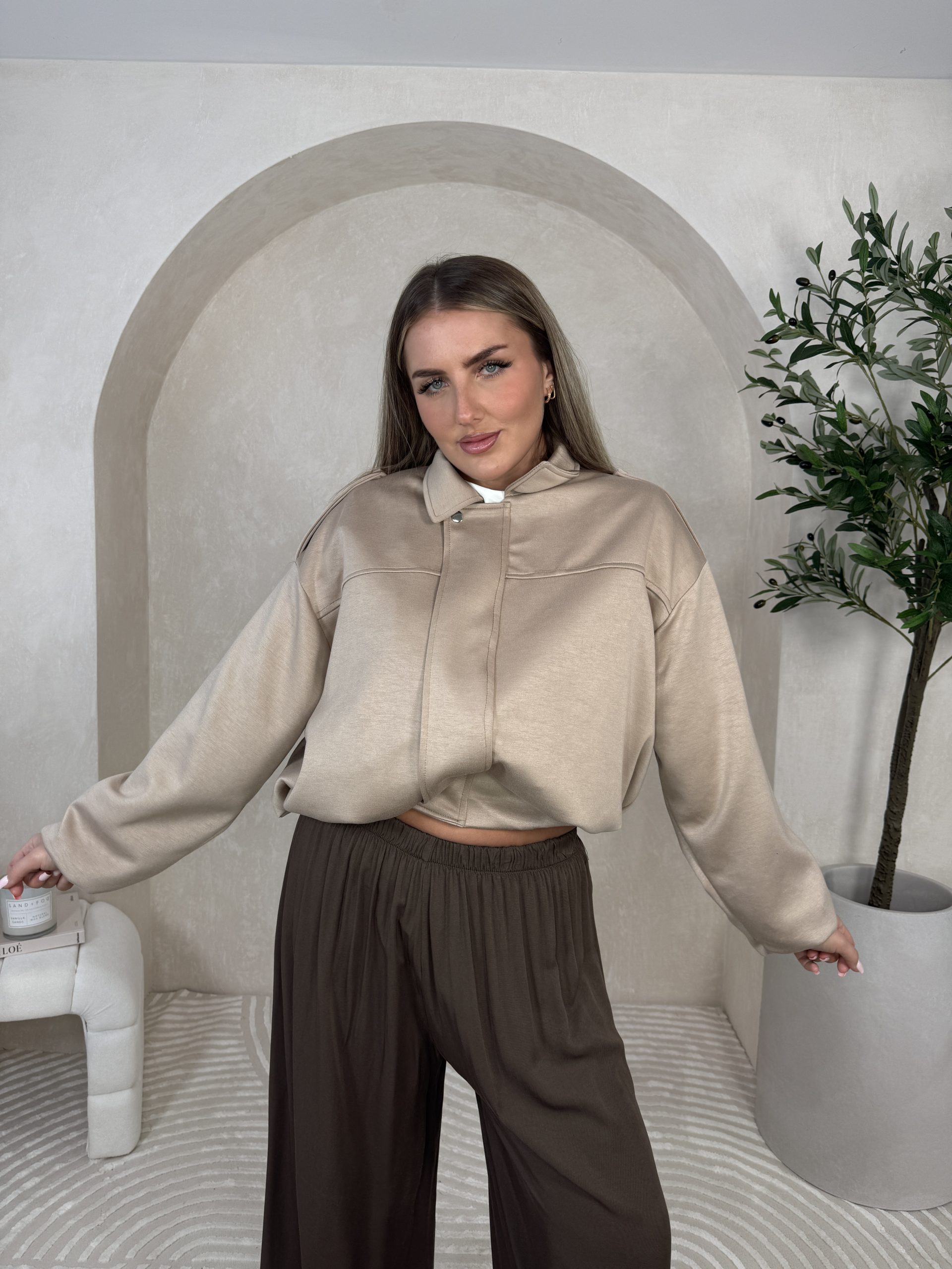 Kurtka o modnym , luźnym kroju z efektownymi szerokimi rękawami. Zapinana na zamek, z elastycznym wykończeniem na samym dole, które podkreśla sylwetkę. Stylowa i wygodna – idealna do codziennych, miejskich stylizacji.