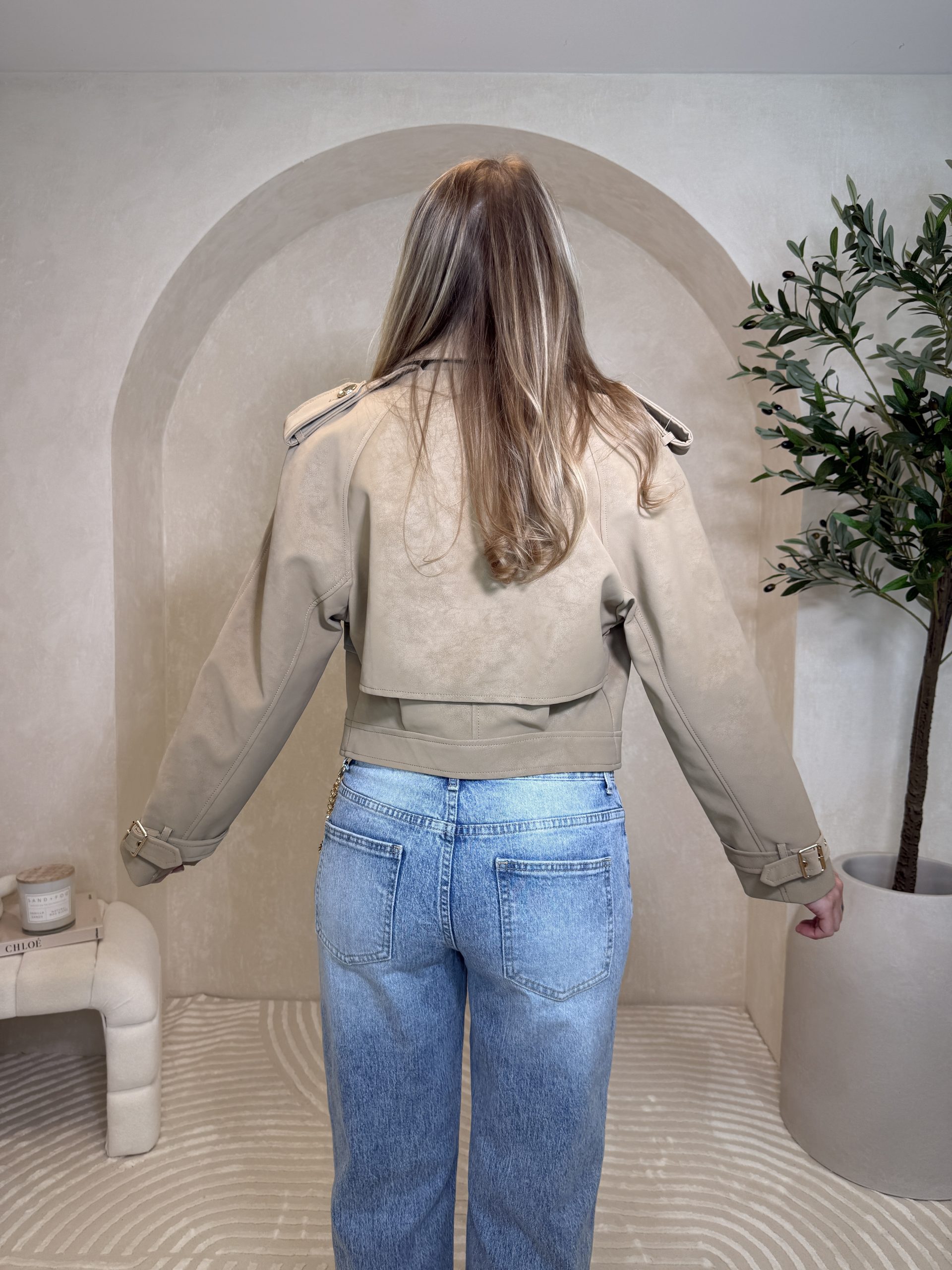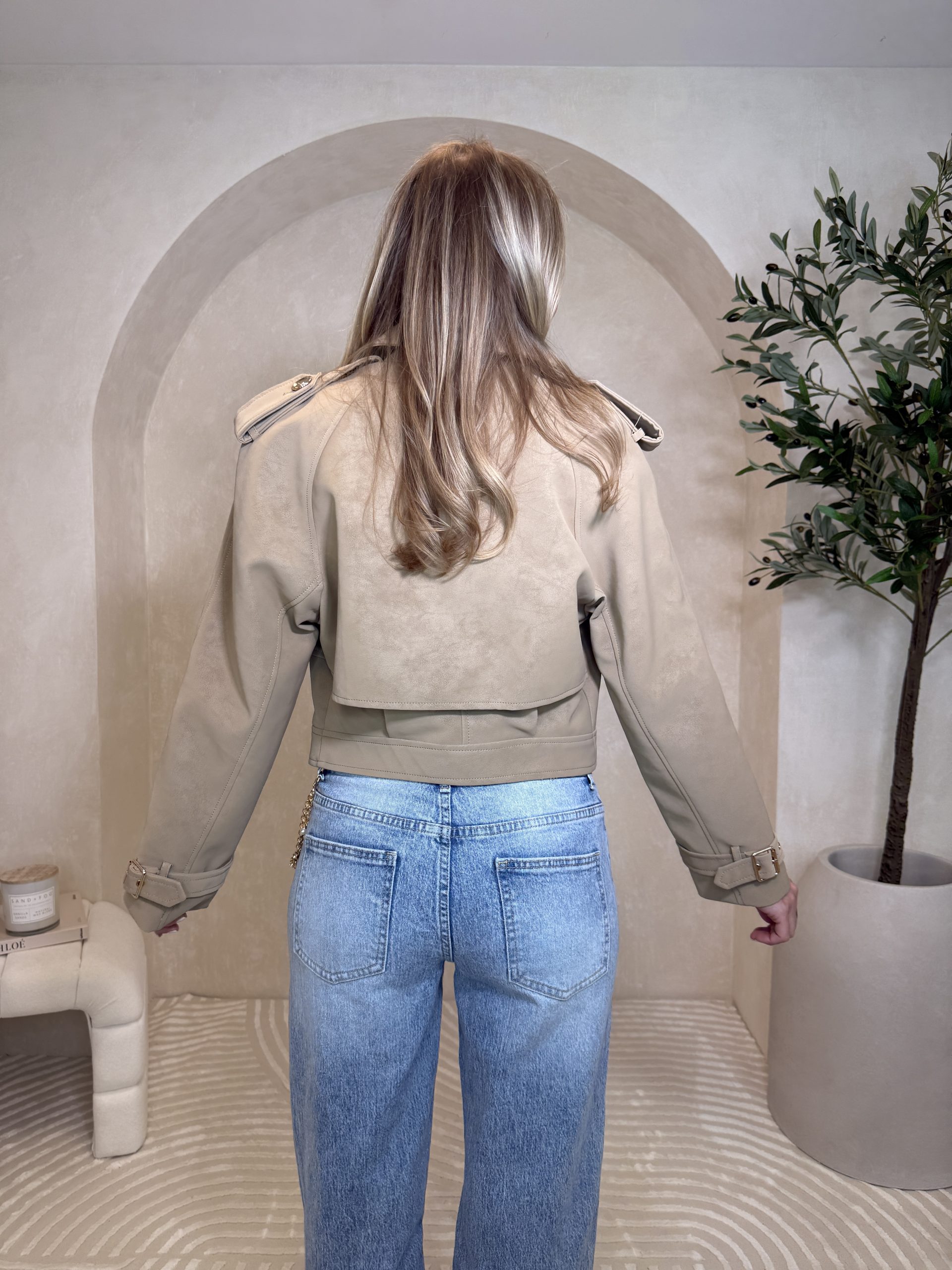 Elegancki, lekko oversizowy krój z szerokimi klapami i ozdobnymi guzikami. Przyjemny materiał o zamszowym wykończeniu nadaję całości piękny i bardzo modowy look. Świetnie wygląda zarówno z jeansami, jak i ze spódnicą.