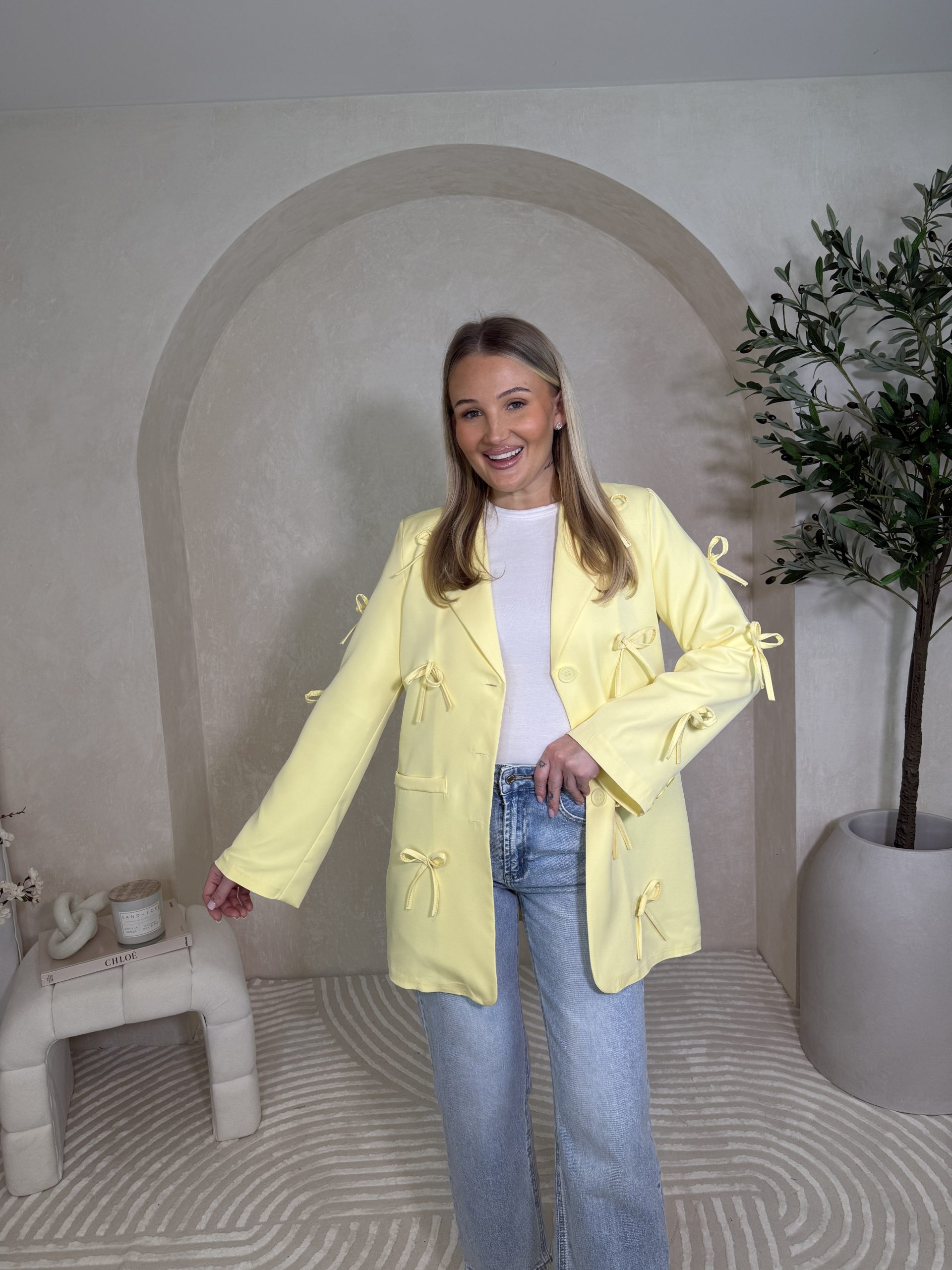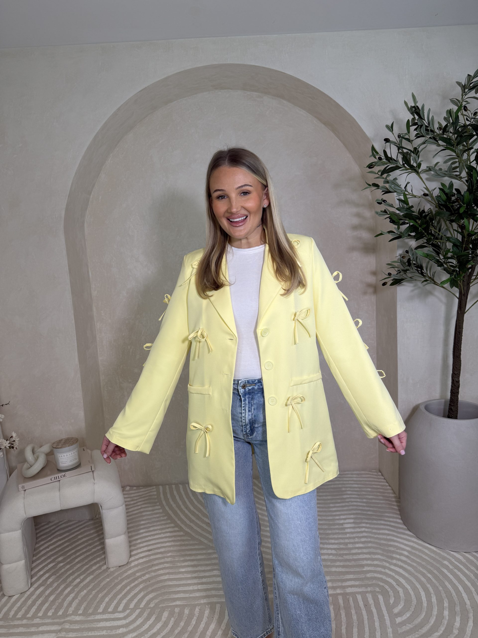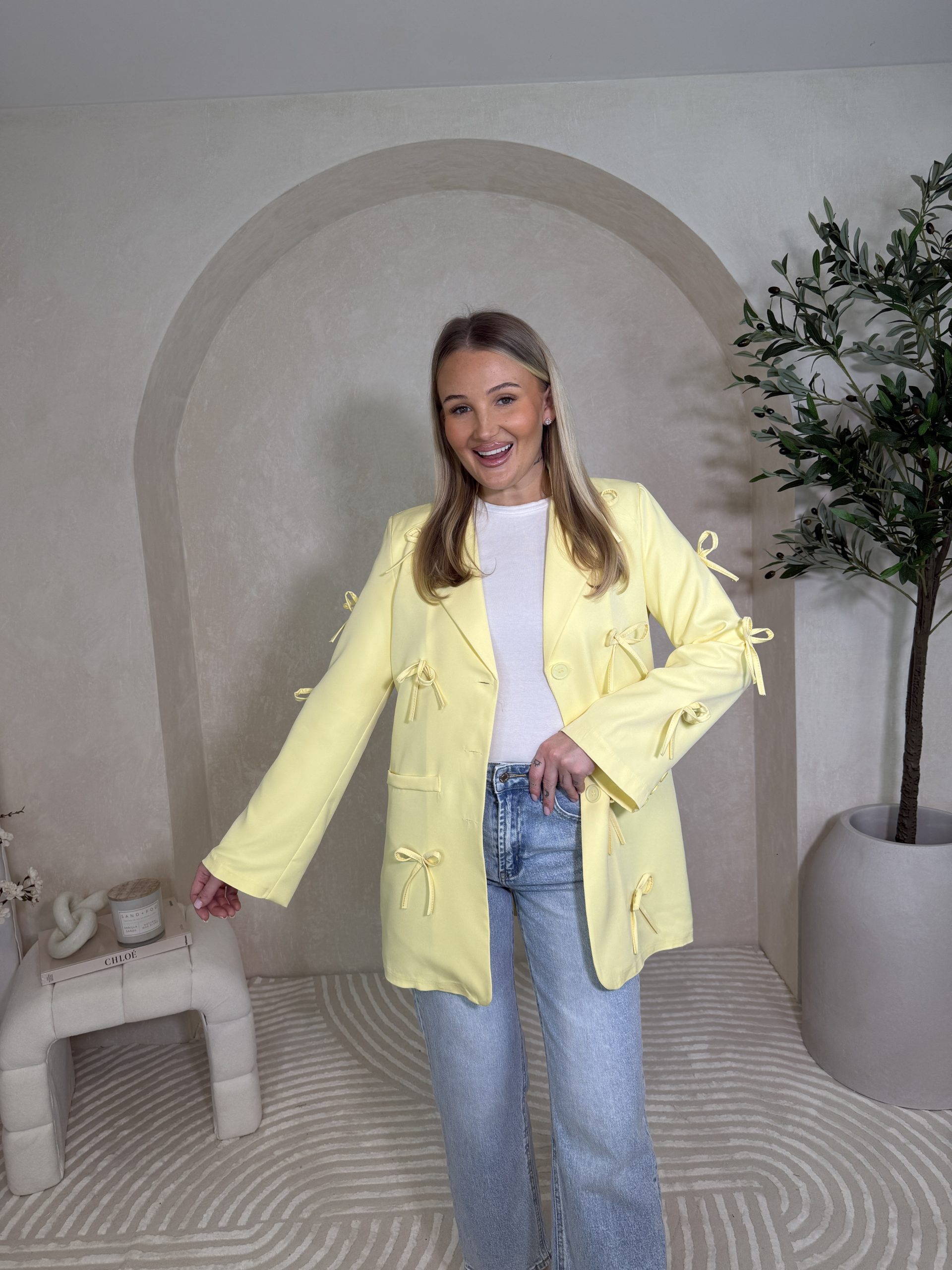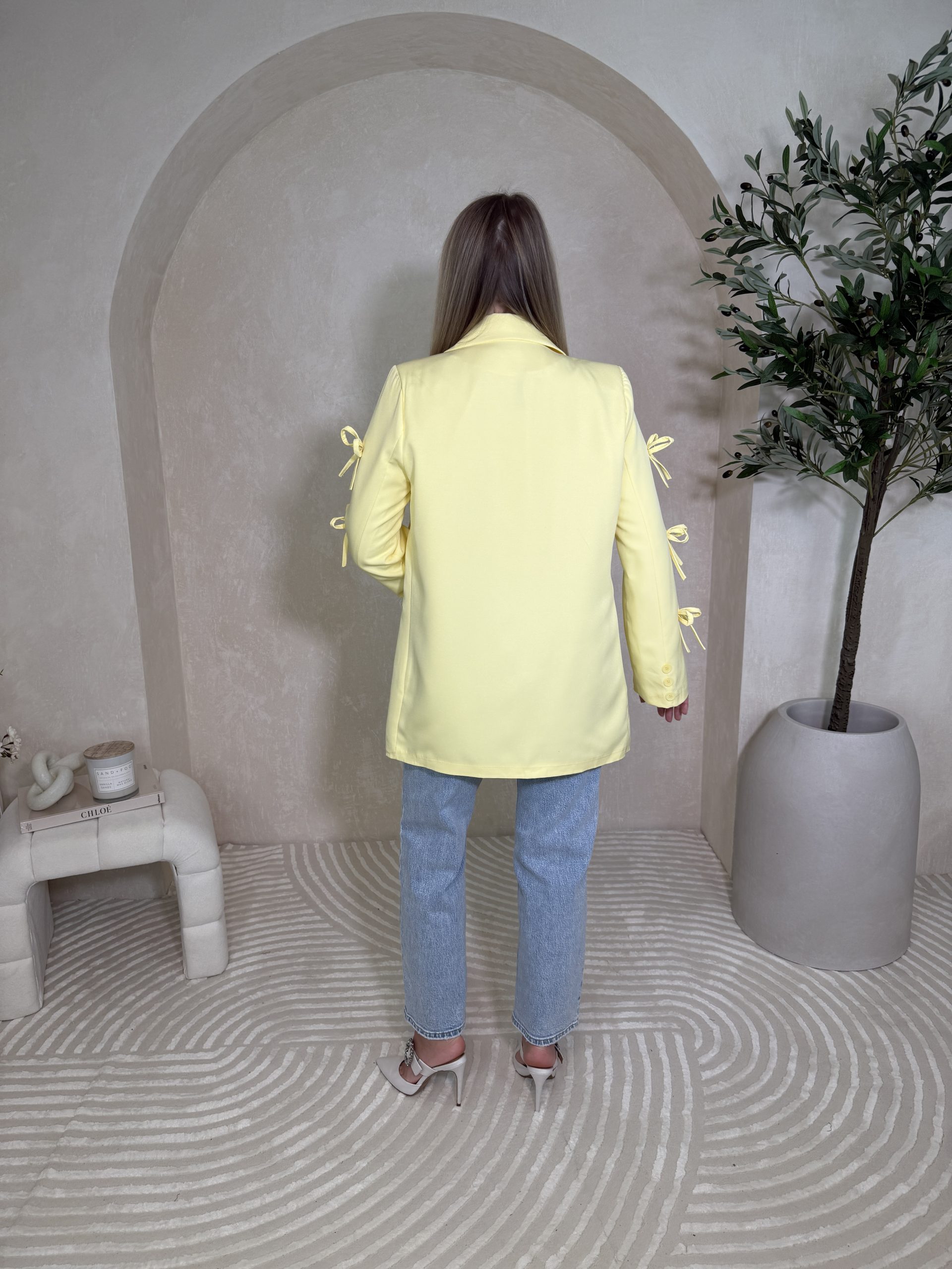 Wyjątkowa i jedyna w swoim rodzaju marynarka o kobiecym kroju, ozdobiona przepięknymi kokardkami, które nadają jej romantycznego charakteru. Klasyczny fason z kołnierzem łączy elegancję z modowym twistem, dzięki czemu świetnie sprawdzi się zarówno w stylizacjach codziennych, jak i tych bardziej wyjątkowych.