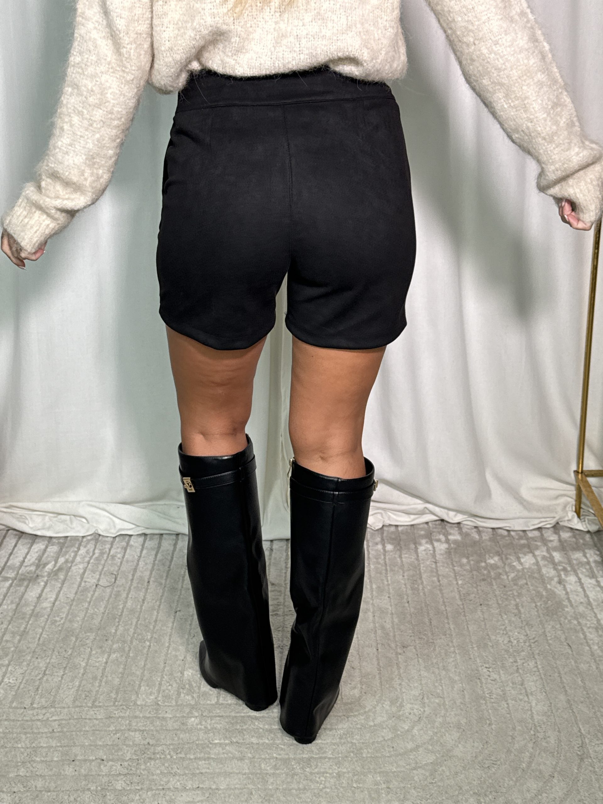 Czarne spodenki to połączenie kobiecego stylu i wygody. Wykonane z materiału przypominającego welur, prezentują się elegancko i stylowo. Model posiada dwie praktyczne kieszenie. Idealne zarówno do codziennych, jak i bardziej eleganckich stylizacji. Połączysz je w każdej stylizacji.