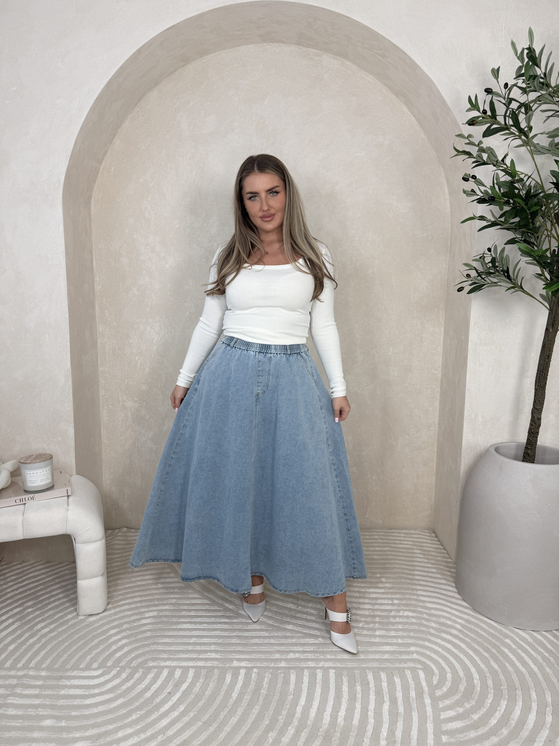 Spódnica jeansowa o luźnym, rozkloszowanym kroju, która pięknie układa się podczas ruchu. Elastyczna talia zapewnia wygodę i komfort noszenia, posiada nowoczesny charakter. Idealna na co dzień, świetnie pasuje do koszuli lub basicowego topu.