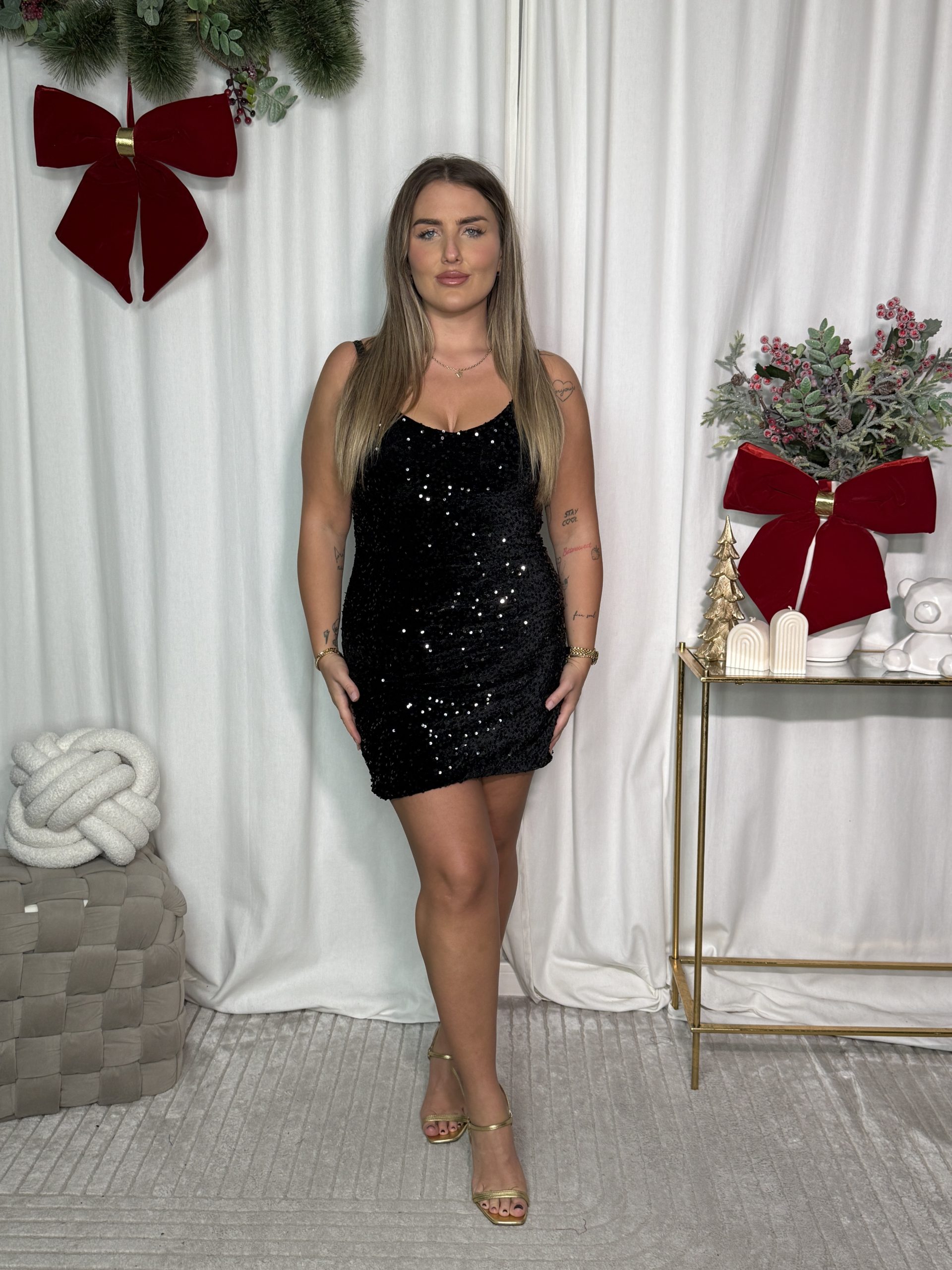 Czarna sukienka mini w cekiny to idealna propozycja na wyjątkowe okazje, imprezy i świąteczne przyjęcia. Model zachwyca subtelnym połyskiem drobnych cekinów,  tworząc efektowny i elegancki look. Dopasowany krój pięknie podkreśla sylwetkę, a delikatne ramiączka dodają seksapilu i lekkości. Sukienka świetnie sprawdzi się w stylizacjach wieczorowych, gwarantując zjawiskowy i pewny siebie wygląd.. Model posiada usztywniane miseczki.