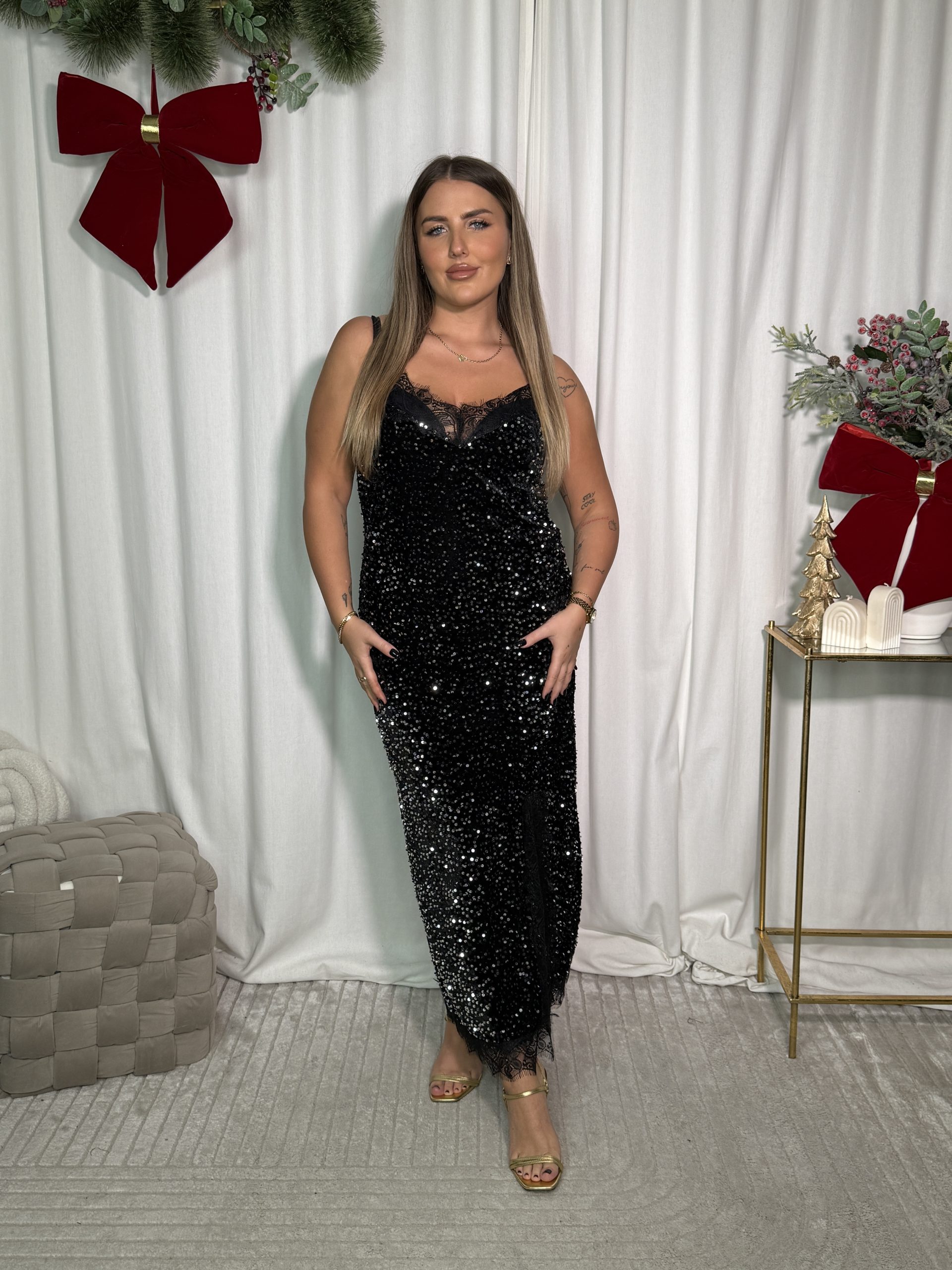 Sukienka maxi z cekinami z lejącym dekoltem wykonana jest materiału zdobionego drobnymi cekinami, idealnie układa się na sylwetce, podkreślając kobiece kształty. Doskonała na specjalne okazje, randki czy wieczorne wyjścia, sukienka zapewnia jednocześnie komfort i styl. Prezentujemy ten model w rozmiarze uniwersalnym. Uzupełnij ją o ulubione dodatki i stwórz niezapomnianą stylizację .