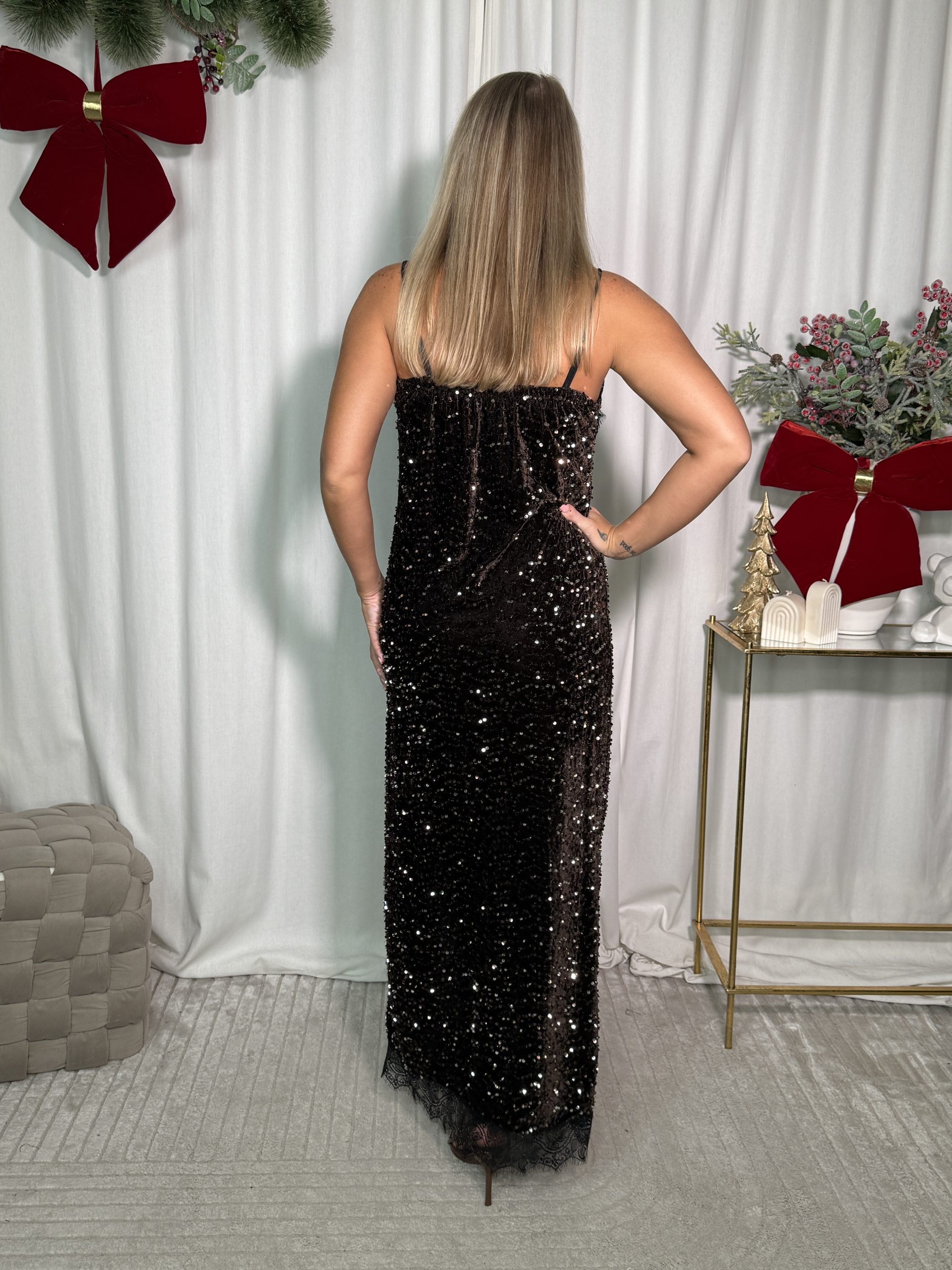 Sukienka maxi z cekinami z lejącym dekoltem wykonana jest materiału zdobionego drobnymi cekinami, idealnie układa się na sylwetce, podkreślając kobiece kształty. Doskonała na specjalne okazje, randki czy wieczorne wyjścia, sukienka zapewnia jednocześnie komfort i styl. Prezentujemy ten model w rozmiarze uniwersalnym. Uzupełnij ją o ulubione dodatki i stwórz niezapomnianą stylizację .