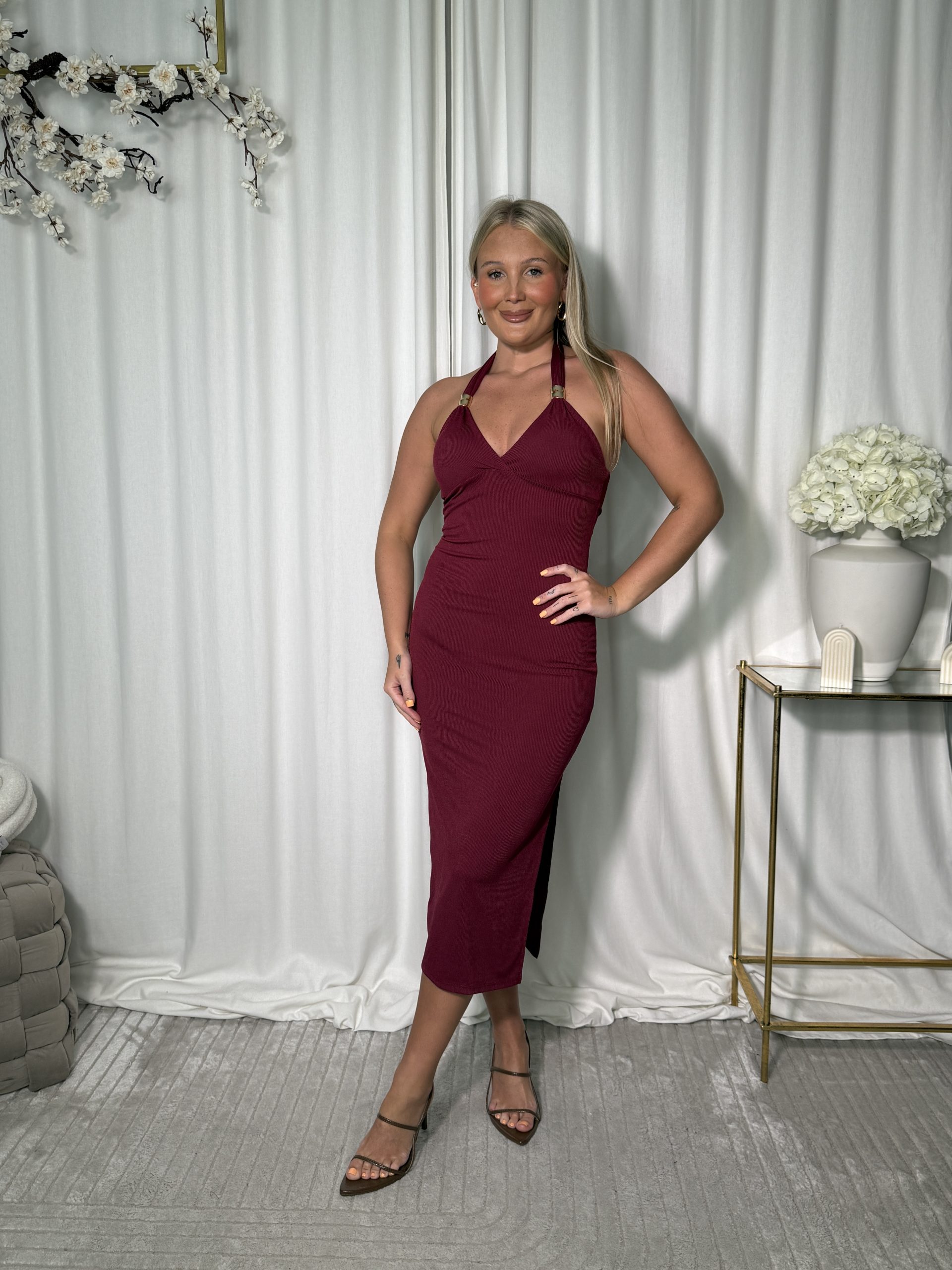 Zmysłowa, dopasowana sukienka midi z wiązaniem na szyi i efektownymi złotymi detalami przy ramiączkach. Jej elastyczny materiał idealnie dopasowuje się do sylwetki, a delikatne rozcięcie z boku dodaje kobiecego charakteru. To model stworzony zarówno na romantyczną kolację, jak i wieczorne wyjście z klasą.