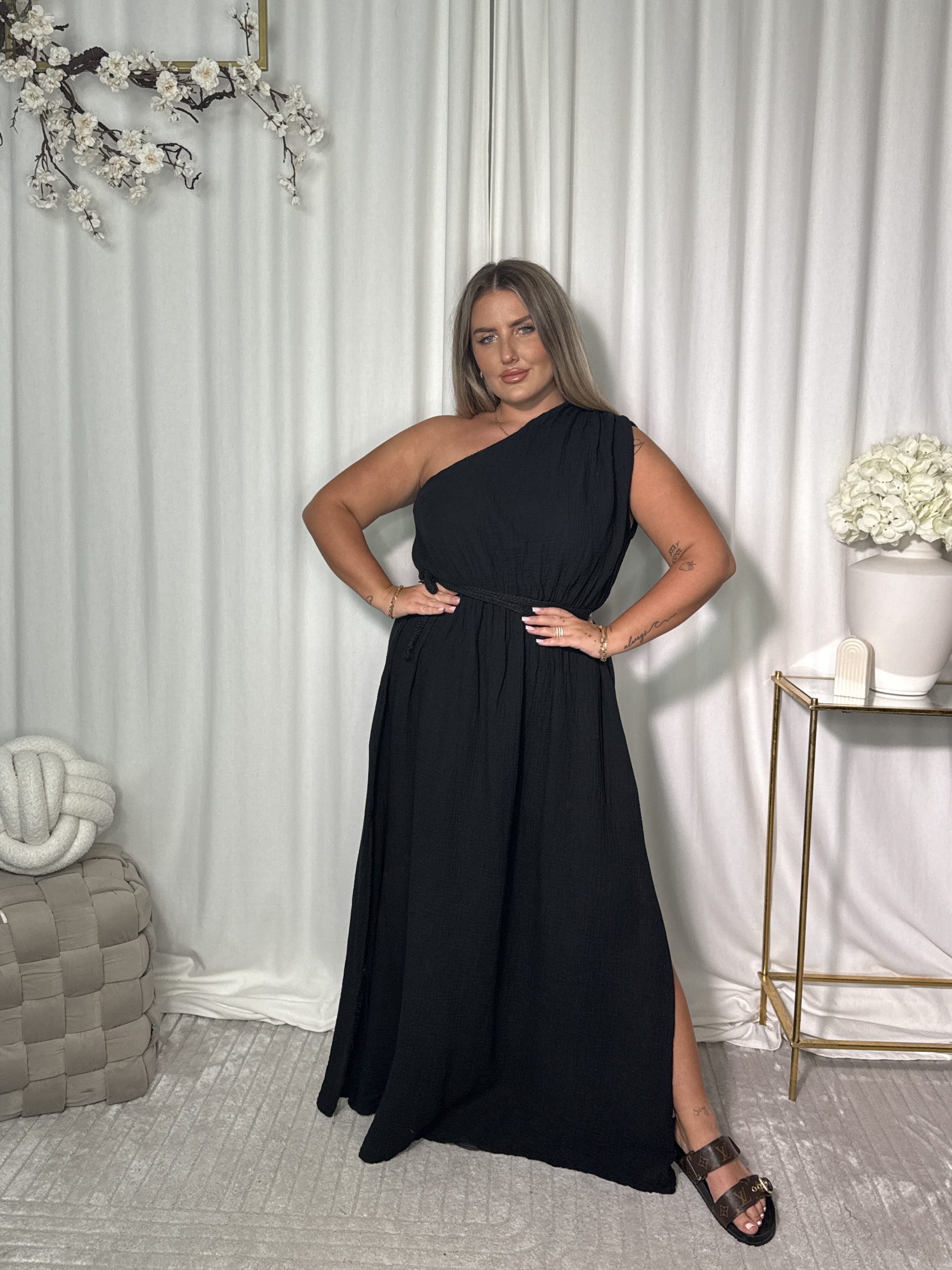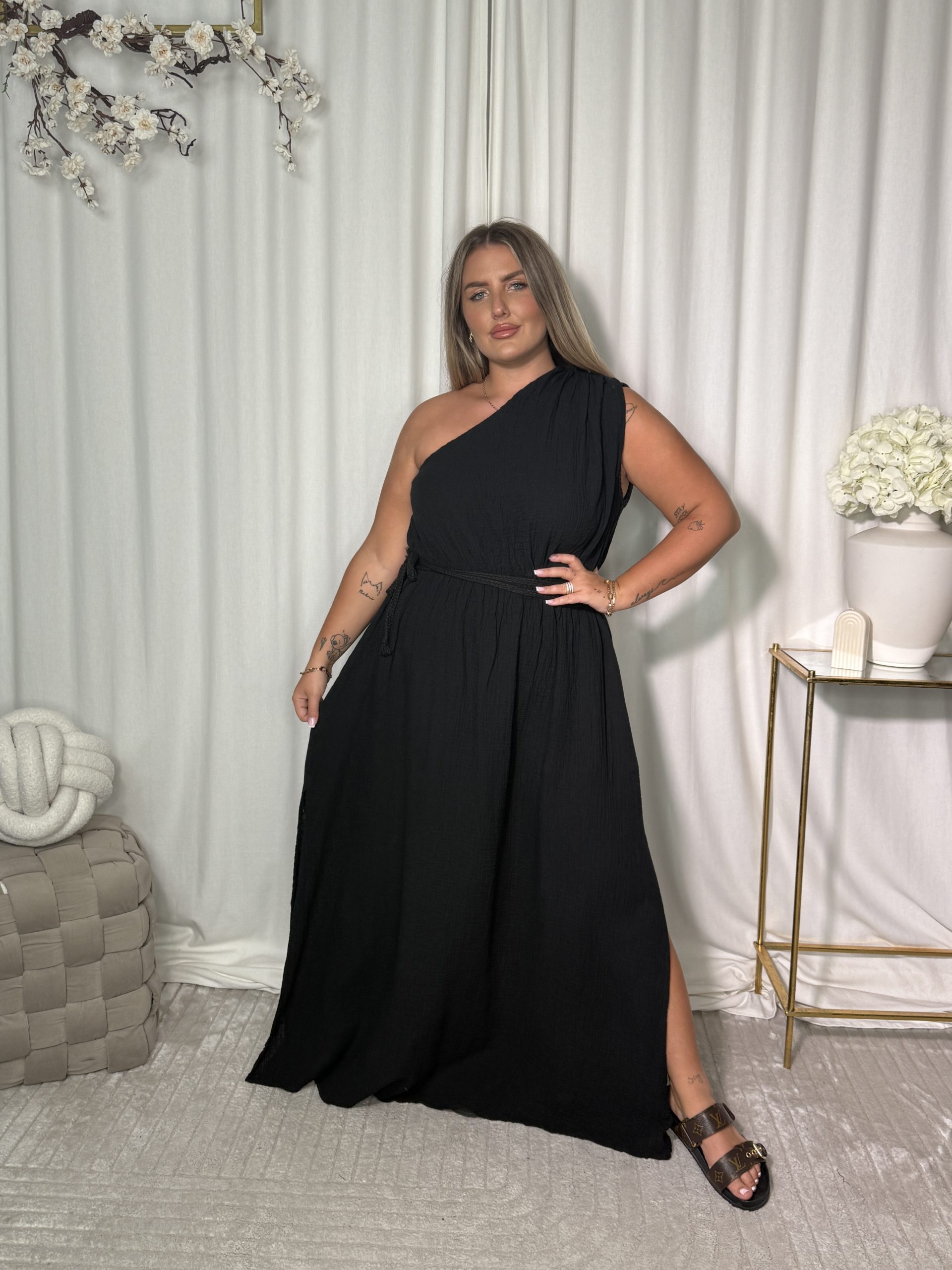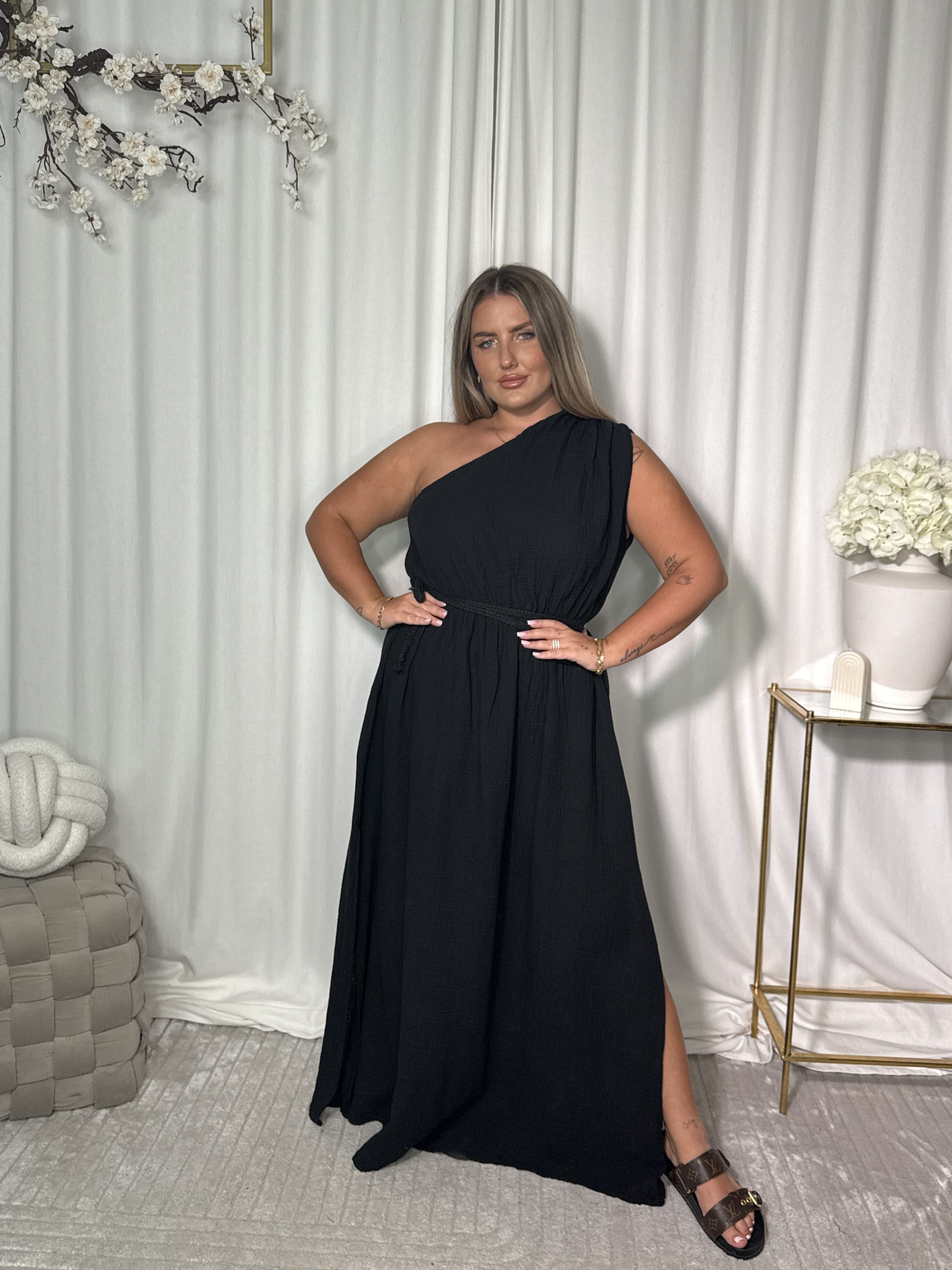 Lekka jak chmurka, wygodna jak piżamka, a przy tym totalnie efektowna! Sukienka z mięciutkiego, oddychającego muślinu z asymetrycznym dekoltem na jedno ramię i rozcięciem z boku. Dzięki wiązanemu paskowi podkreśla talię i pięknie układa się w ruchu. Idealna na lato – zarówno na plażę, jak i na wyjście w miasto.