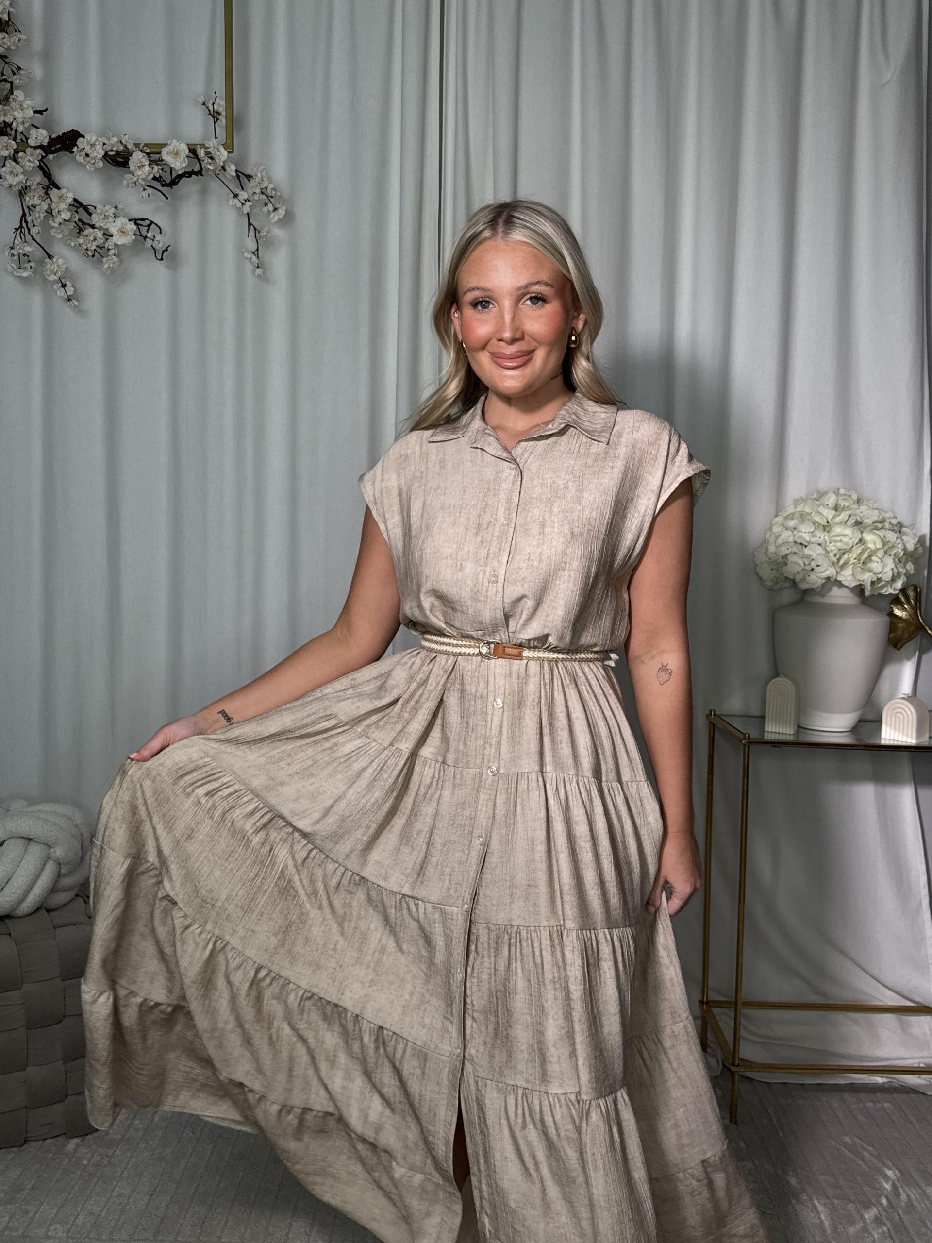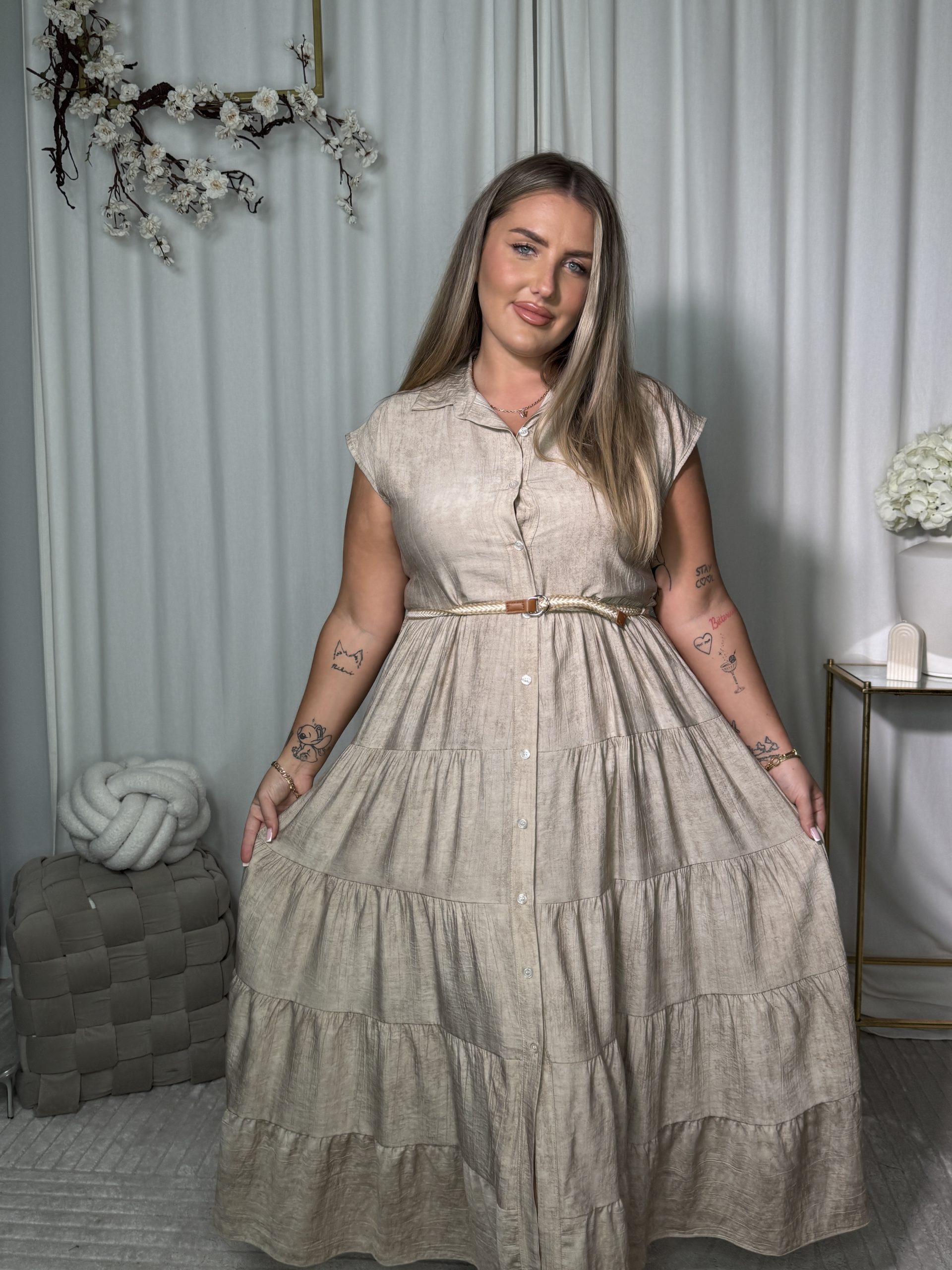 Klasyczny koszulowy krój, zwiewny dół i delikatny pasek w talii sprawiają, że sylwetka wygląda smukło i kobieco.