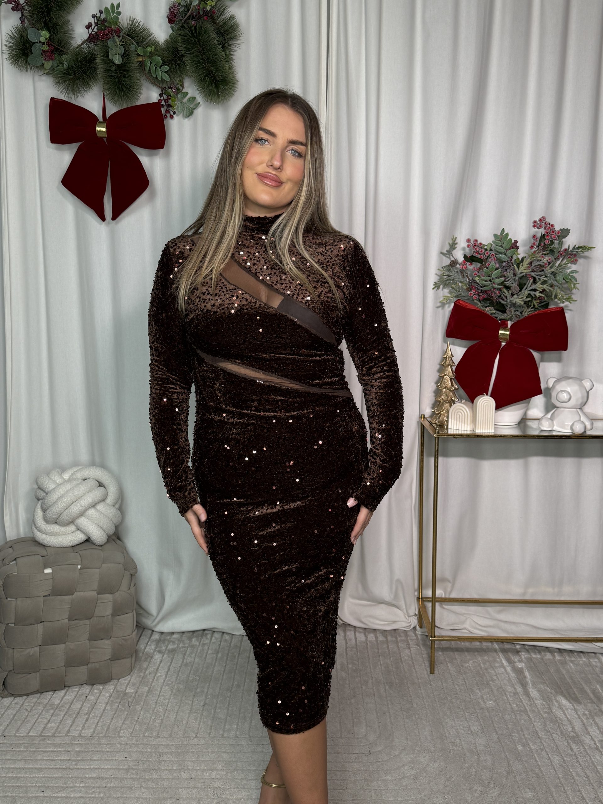 Sukienka to propozycja, która łączy w sobie blask, kobiecość i nowoczesny charakter. Jej dopasowany krój podkreśla sylwetkę, a klasyczny kolor nadaje stylizacji luksusowego tonu. Całość pokryta subtelnie połyskującymi cekinami prezentuje się wyjątkowo efektownie – idealnie na wieczorne wyjścia i specjalne okazje. Prawdziwą ozdobą modelu jest lejący, dekoracyjny tył, który nadaje sukience zmysłowości i eleganckiej lekkości.