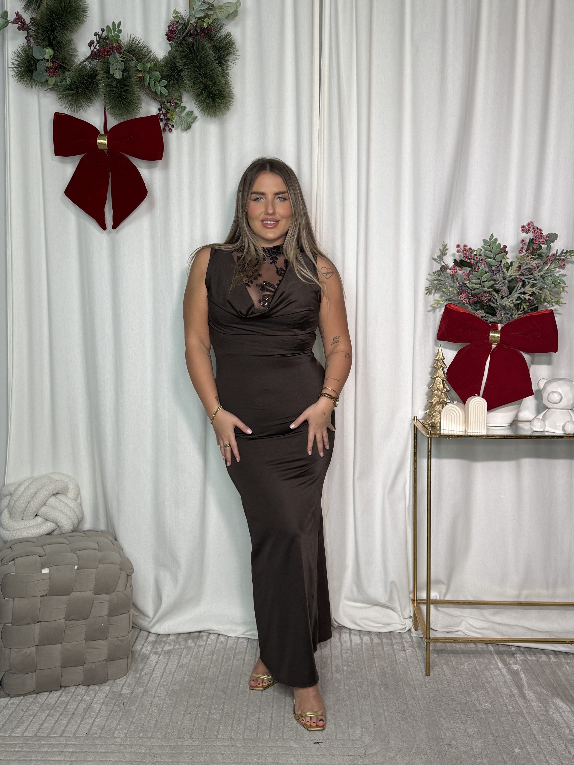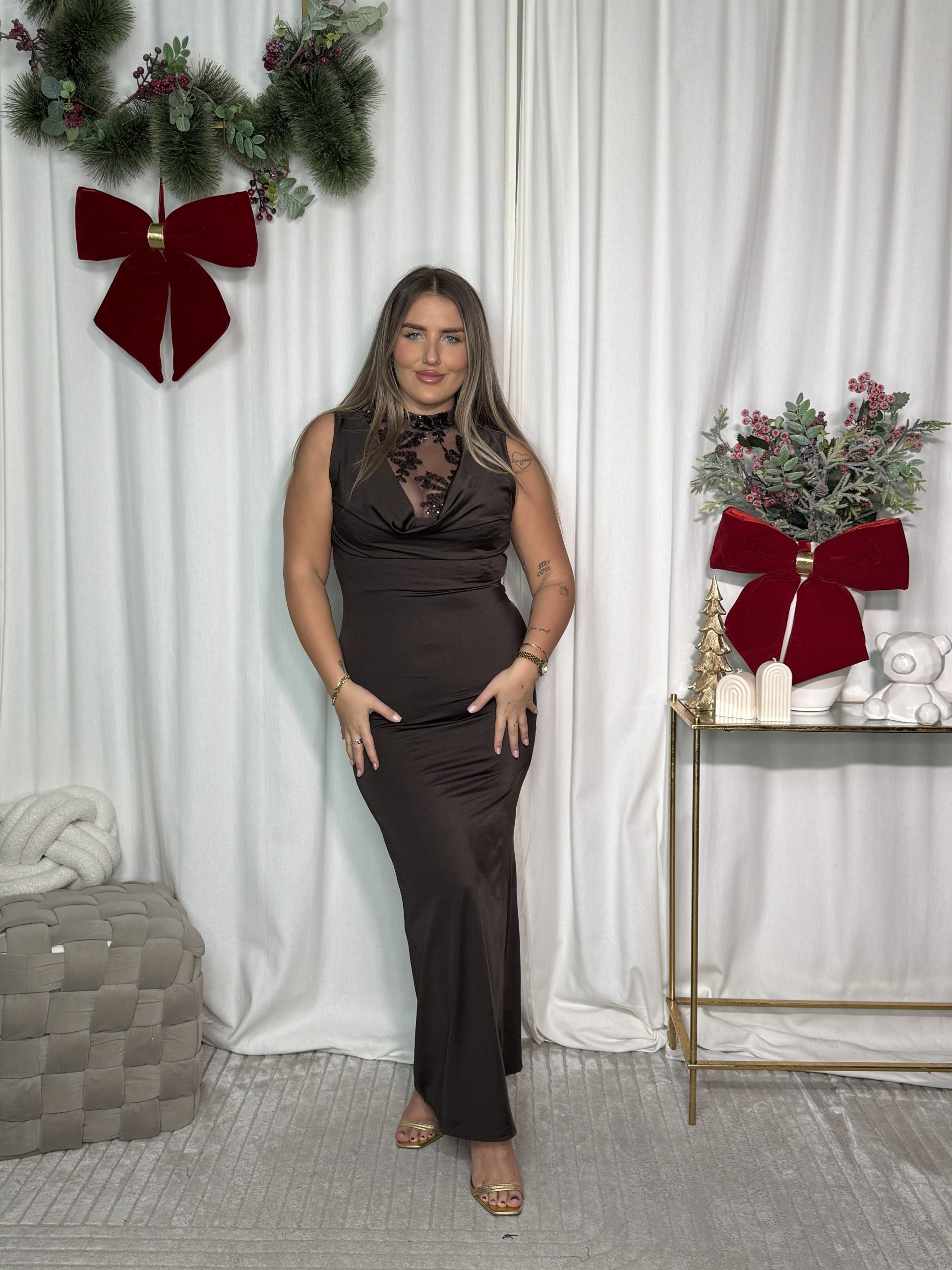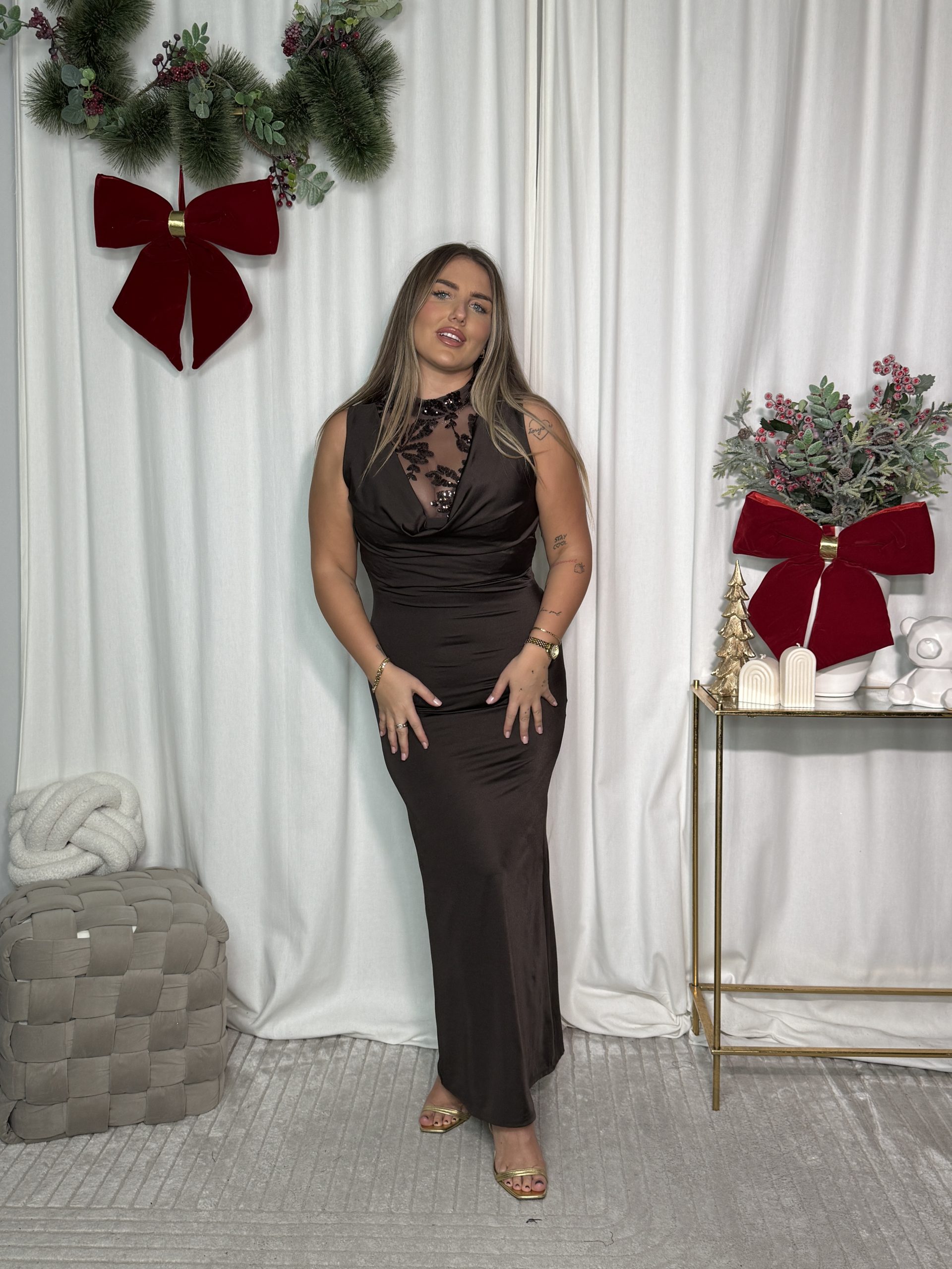 Sukienka  to efektowna, pełna blasku propozycja idealna na wieczorne wyjścia. Pokrycie cekinami nadaje jej eleganckiego połysku, który przyciąga uwagę przy każdym ruchu. Przezroczysta siatka na dekolcie dodaje lekkości i subtelnie przełamuje intensywny połysk. To model, który łączy nowoczesny styl z odrobiną glamour, gwarantując spektakularny efekt.