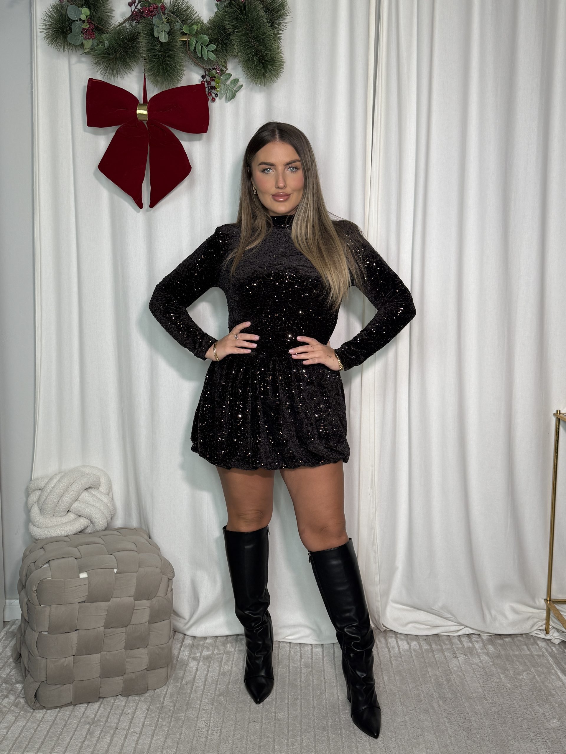 Sukienka Velveni wyjątkowe połączenie blasku i kobiecej lekkości. Jej subtelnie rozkloszowany krój pięknie układa się w ruchu, podkreślając sylwetkę i dodając jej delikatnej, tanecznej dynamiki. Ozdobiona błyszczącymi cekinami przyciąga uwagę i dodaje stylizacji efektu, idealna na wieczorne wyjścia.