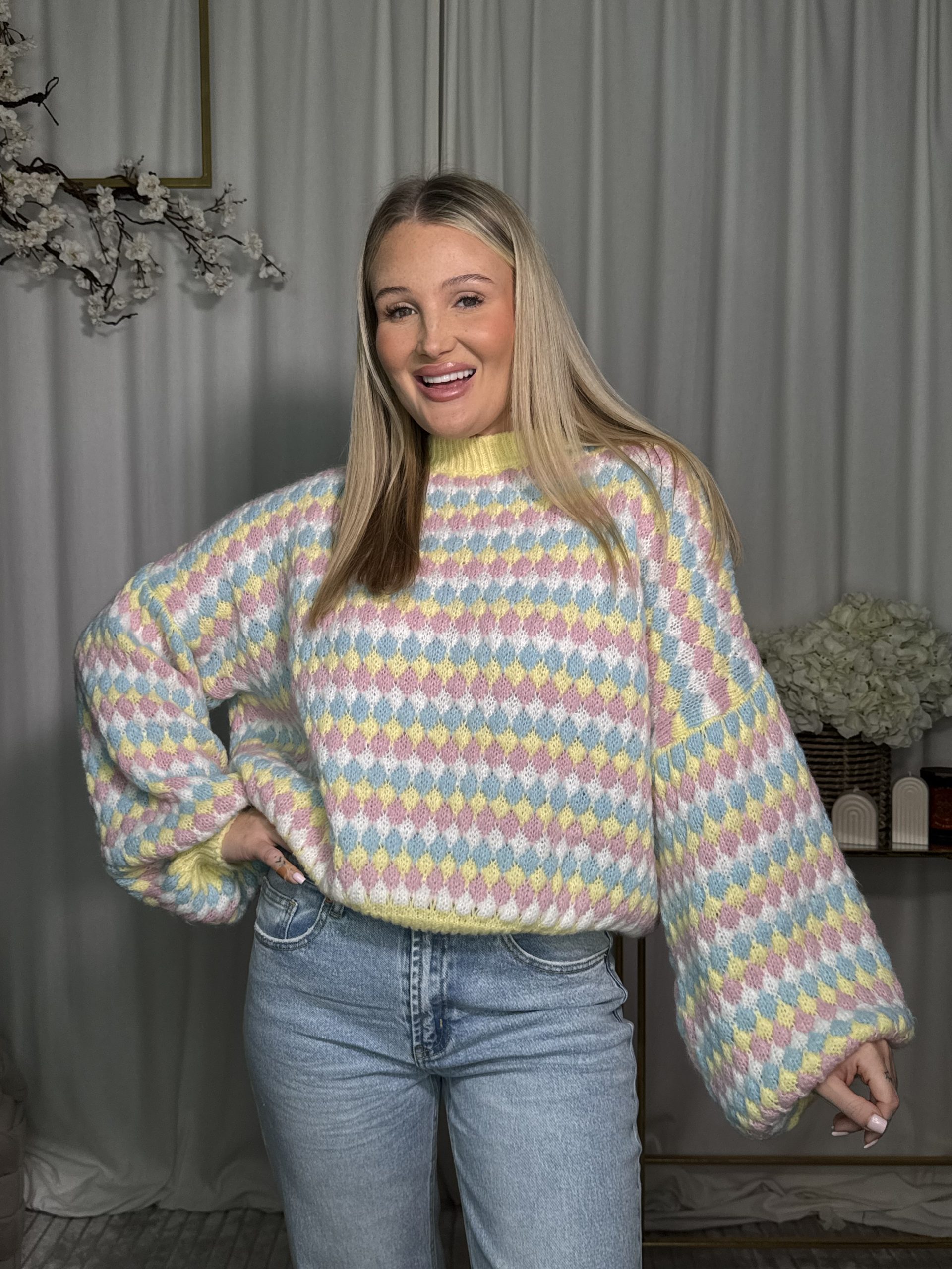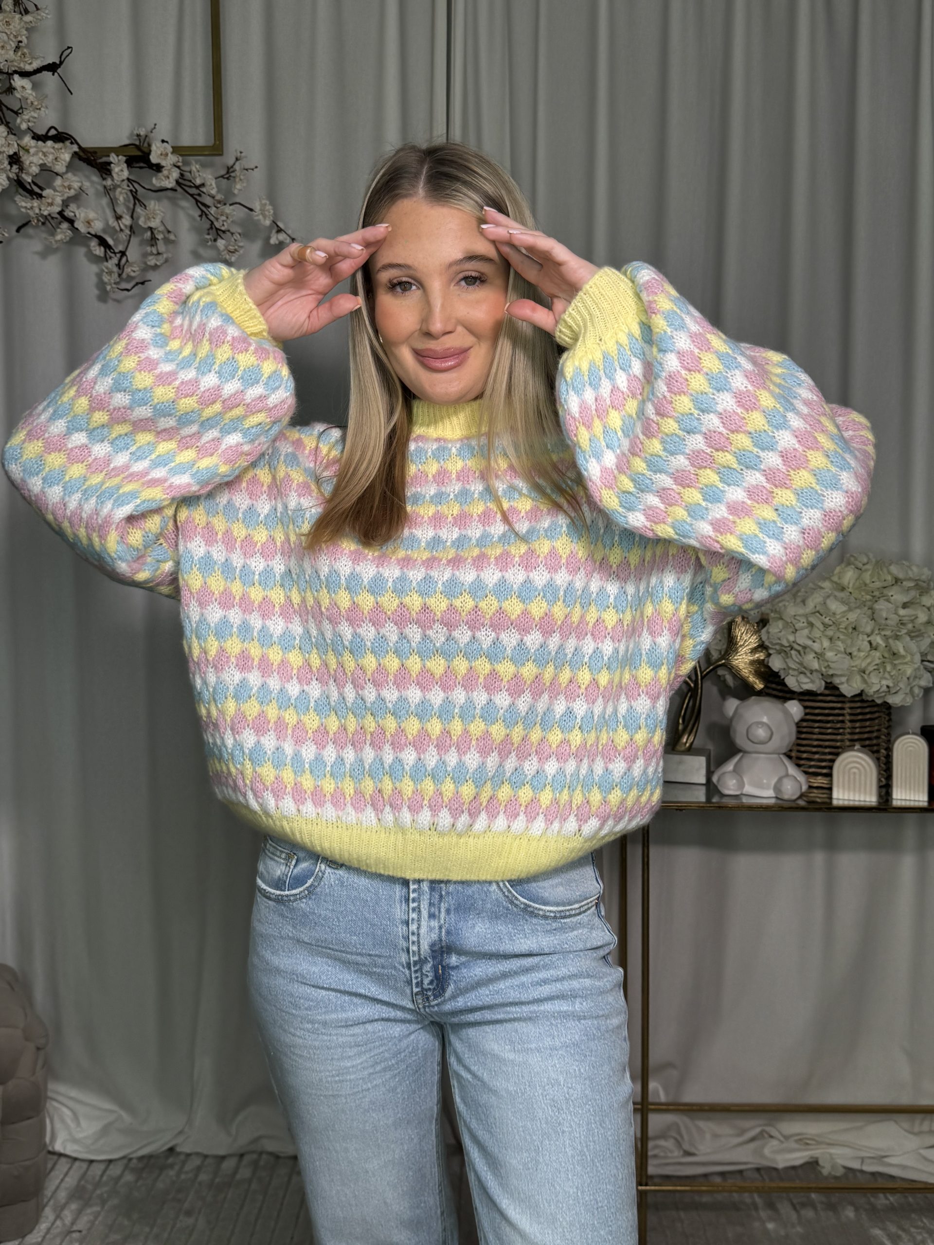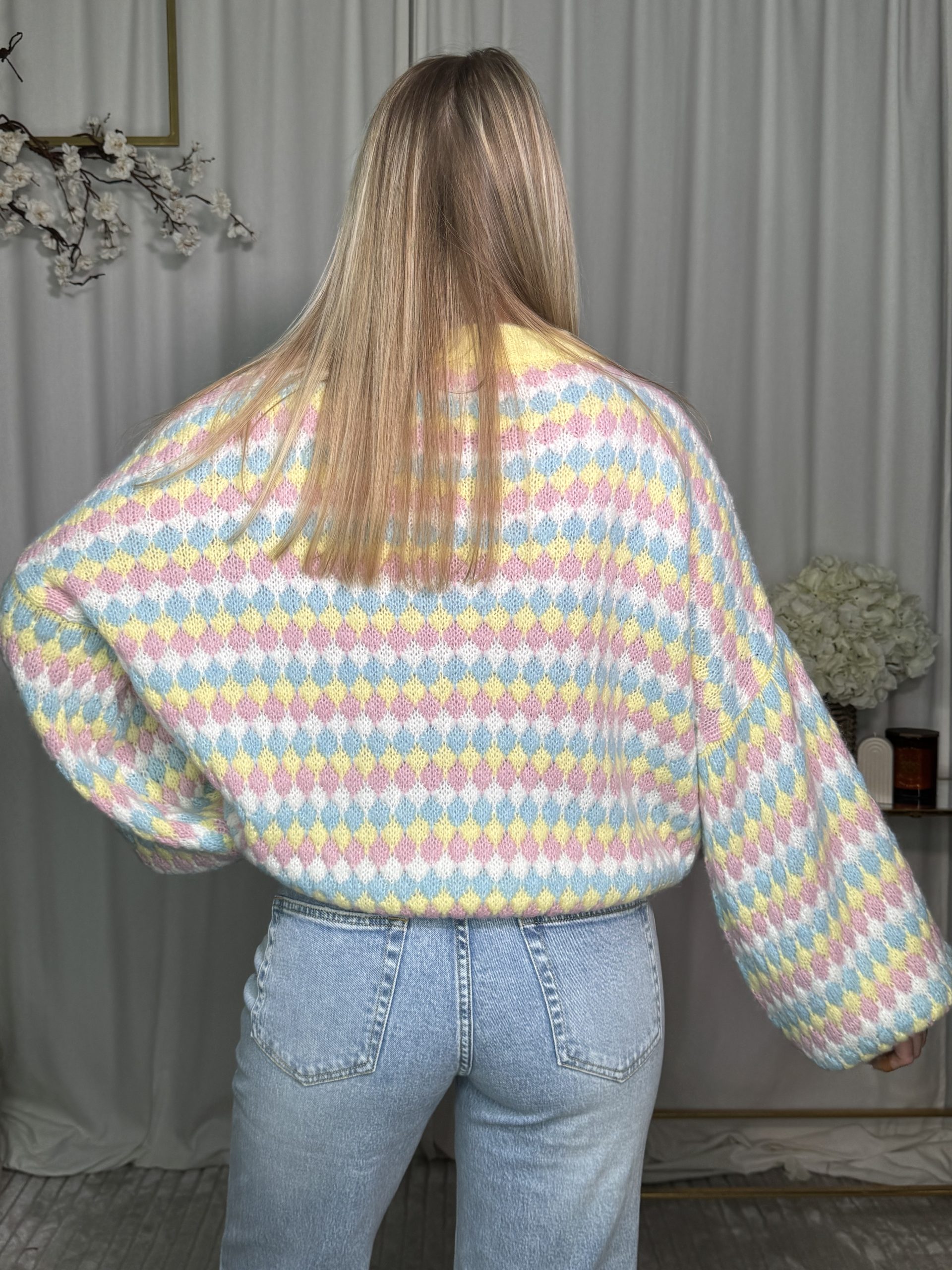 Sweter o puszystej strukturze, zdobiony kolorowym geometrycznym wzorem w odcieniach żółci, różu i błękitu. Luźny fason świetnie sprawdzi się do wiosennych stylizacji – pięknie komponuje się z jeansami i spódnicami z wysokim stanem.