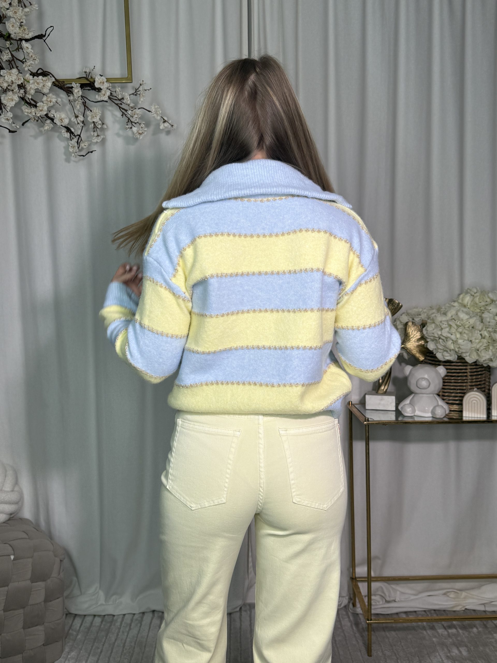 Miękki, krótki sweter w pastelowe paski z pół golfem zapinanym na zamek. Lekki, przyjemny w dotyku i bardzo komfortowy w noszeniu – idealny jako główna baza naszej stylizacji, w sam raz na zbliżającą się wiosne. Występuje w wielu przepięknych wersjach kolorystycznych.